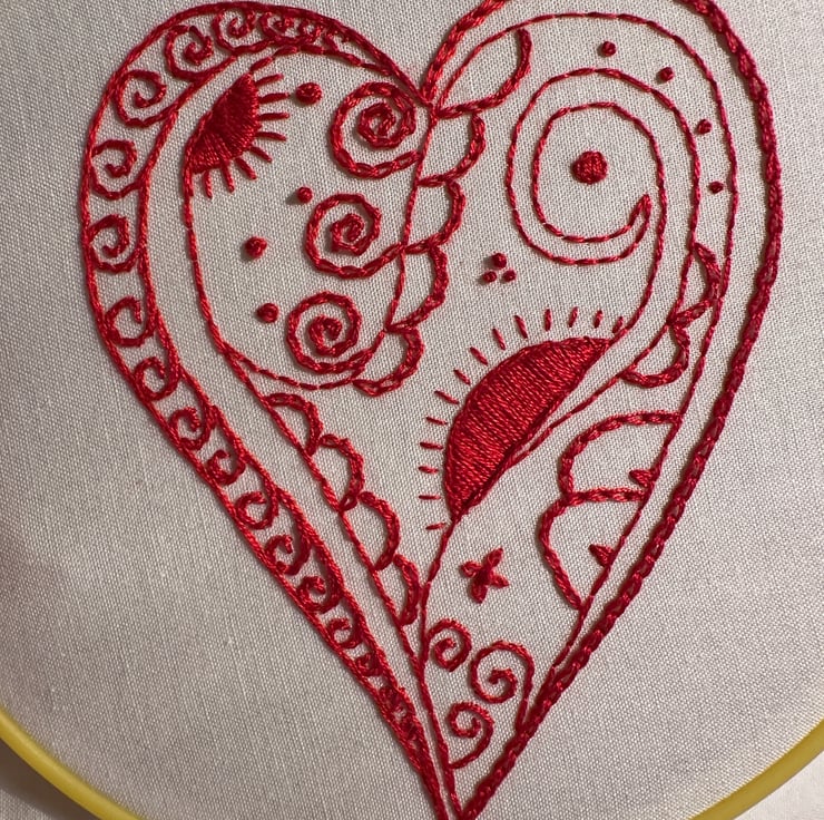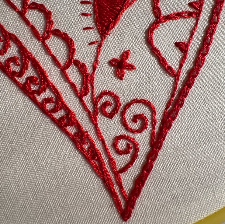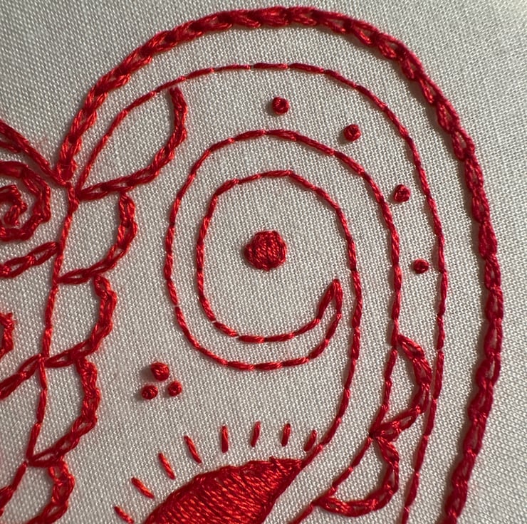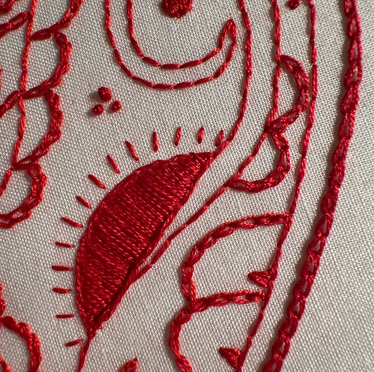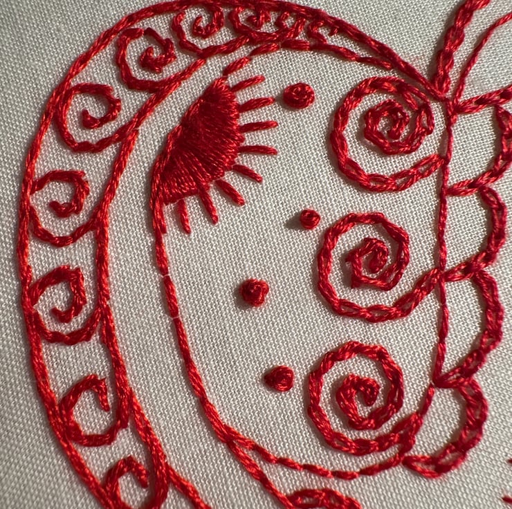 A host of different textured stitches in a bright red thread featuring abstract swirls, scrolls and sunshines.