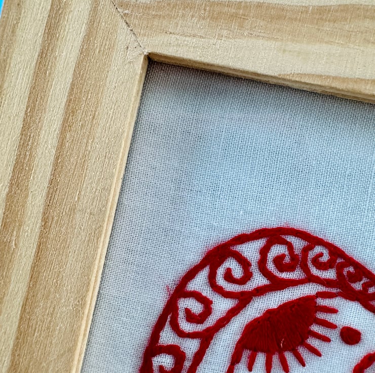 Hand drawn and embroidered with quality, colourfast DMC thread on a natural pure linen background, it has been mounted in a wooden frame with glass front. This can be wall mounted or has an inbuilt stand to sit on a shelf.
