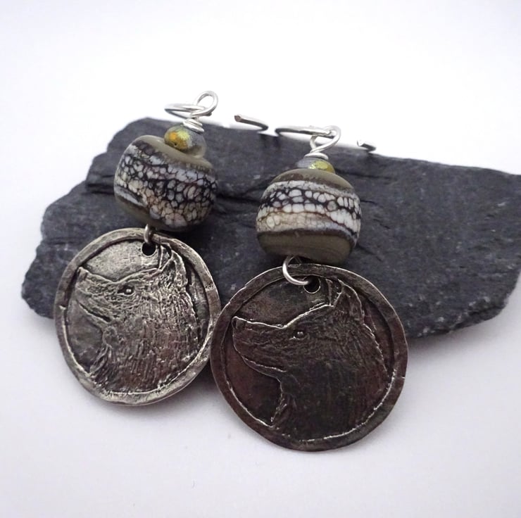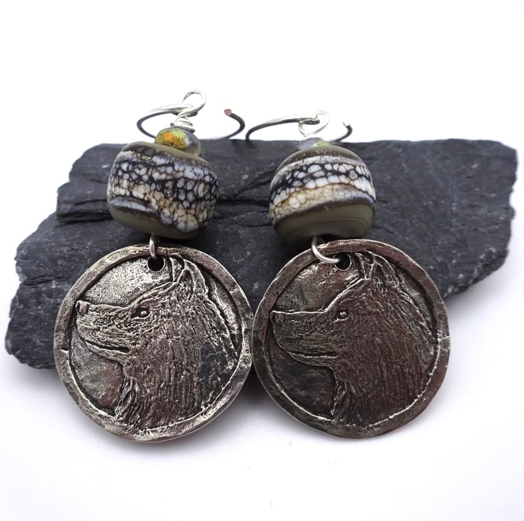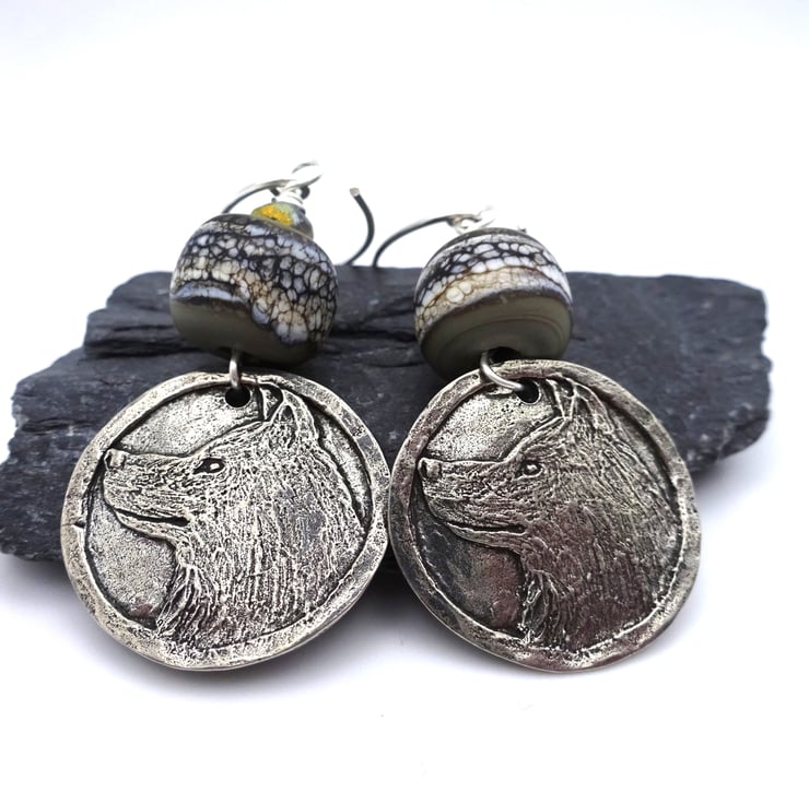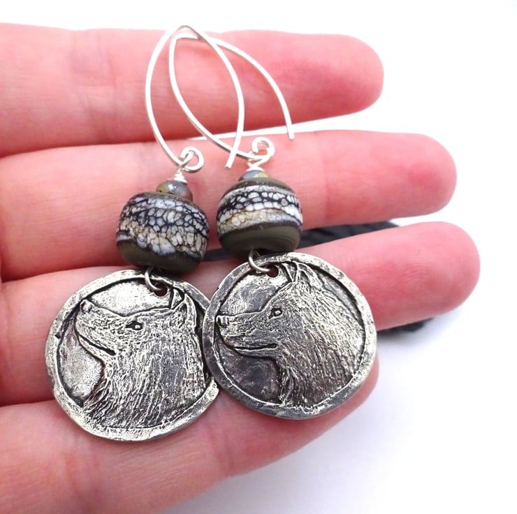 A pair of earrings made with sterling silver ear wires, handmade lampwork grey glass beads and handmade pewter wolf charms.