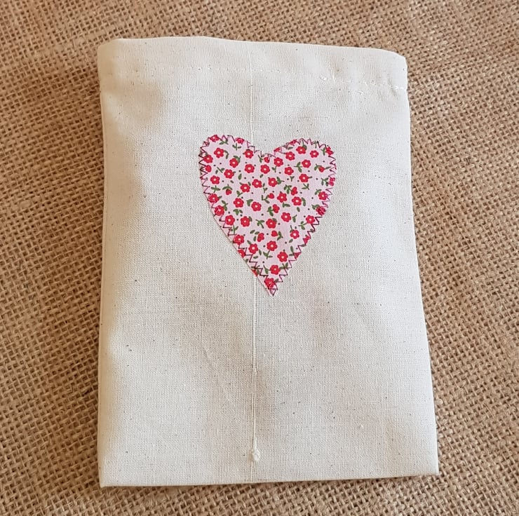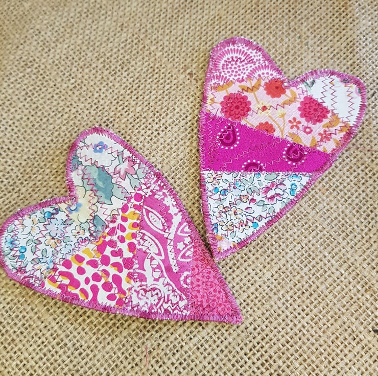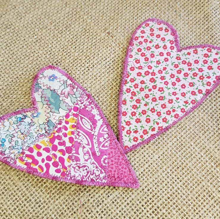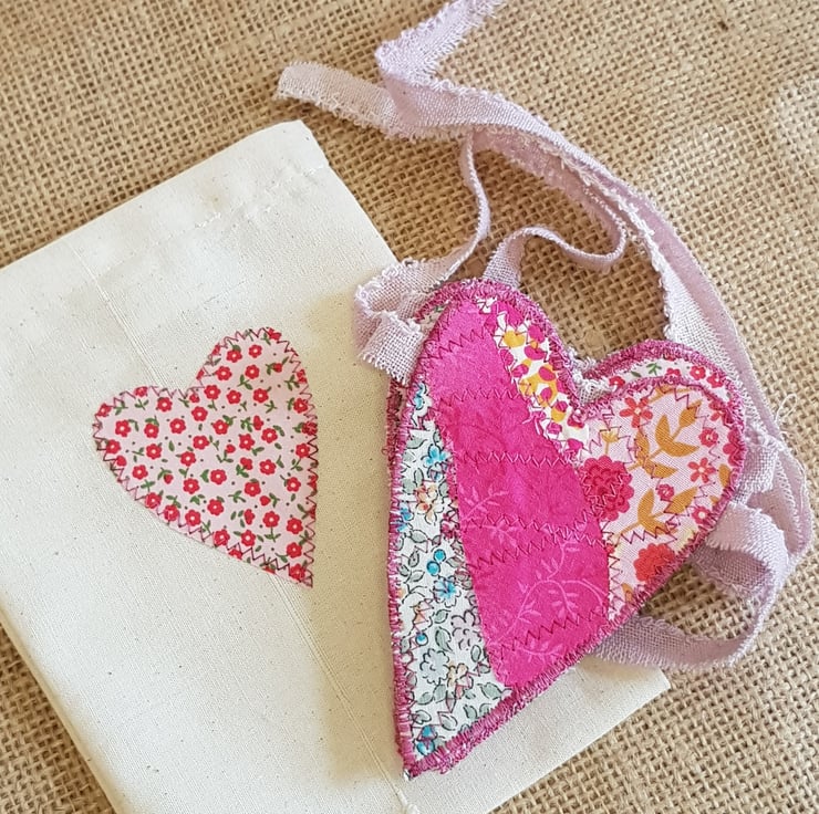 I have stitched small pieces of cotton fabric onto hessian, backed each heart with a coordinating cotton fabric and stitched five hearts onto a linen ribbon.