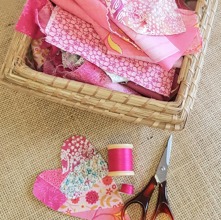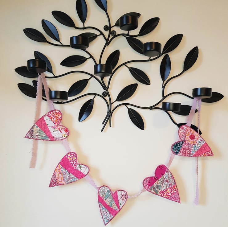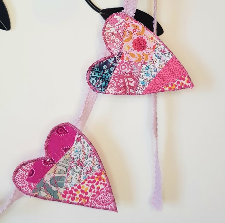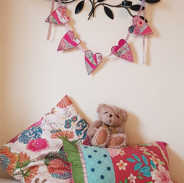This pretty heart garland is made using scraps of fabric. It is ideal for a Valentine's celebration, or for cheering up any space.