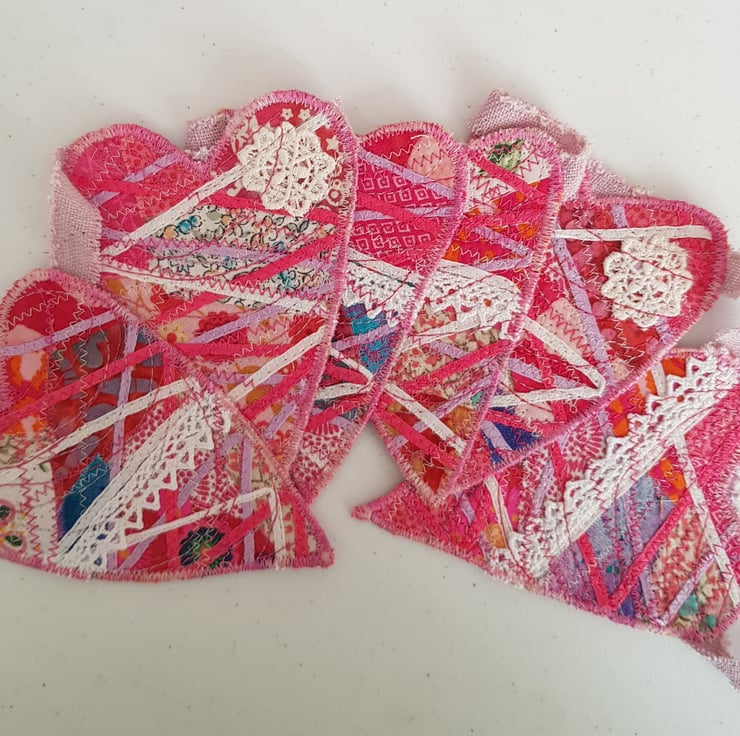 I have stitched small pieces of cotton fabric onto hessian, backed each heart with a coordinating cotton fabric and stitched five hearts onto a linen ribbon.