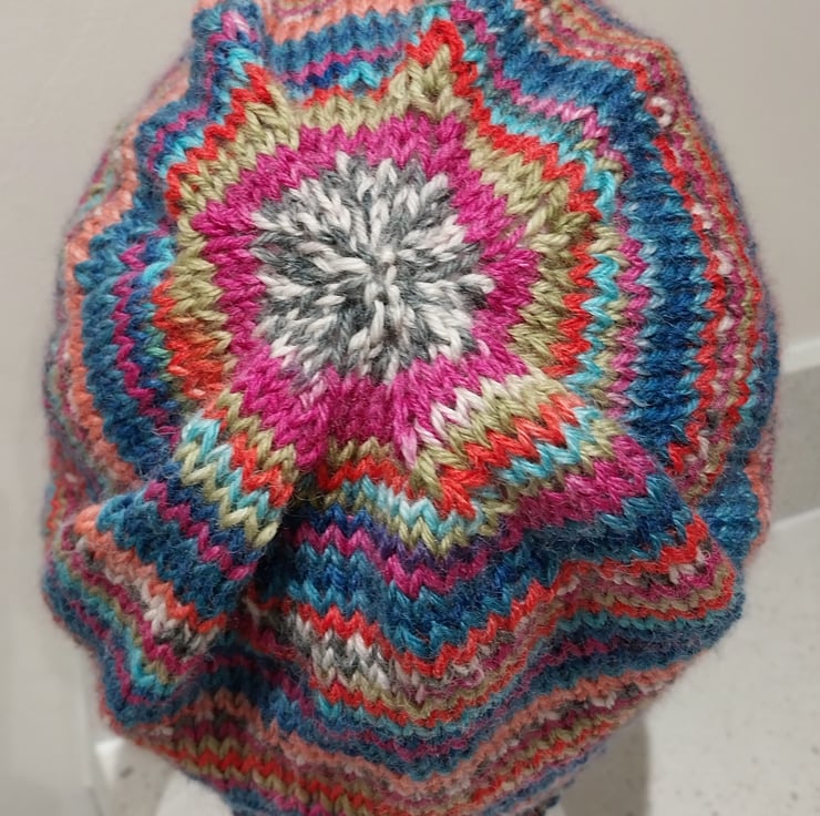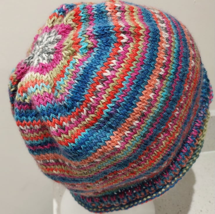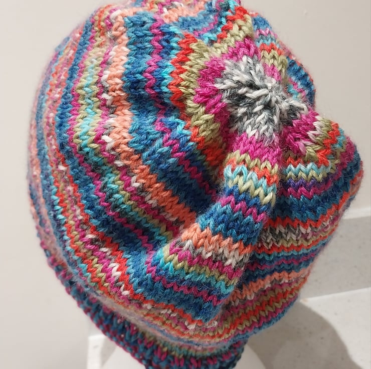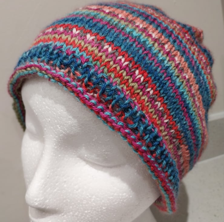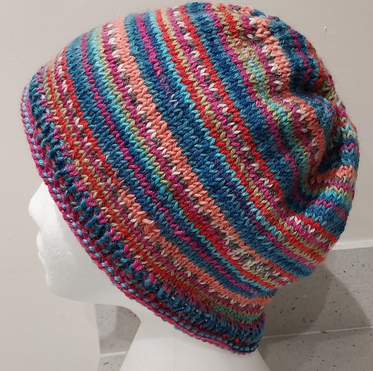 This hat has been hand knitted in the round to show off the stripe pattern brilliantly. It is a simple roll up design with a rib band to help hold the hat's shape.