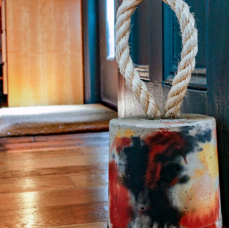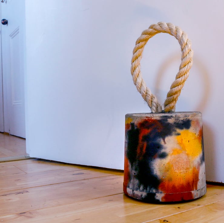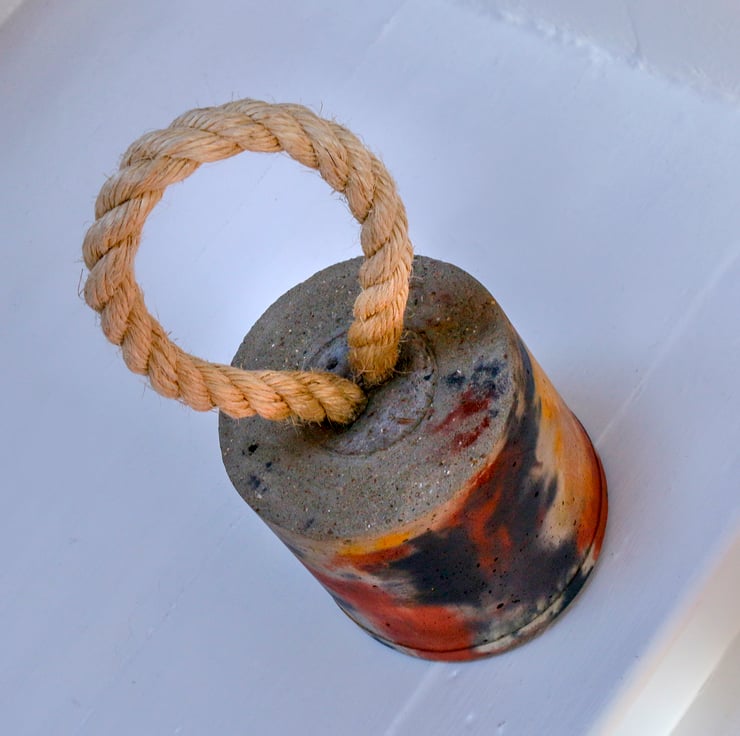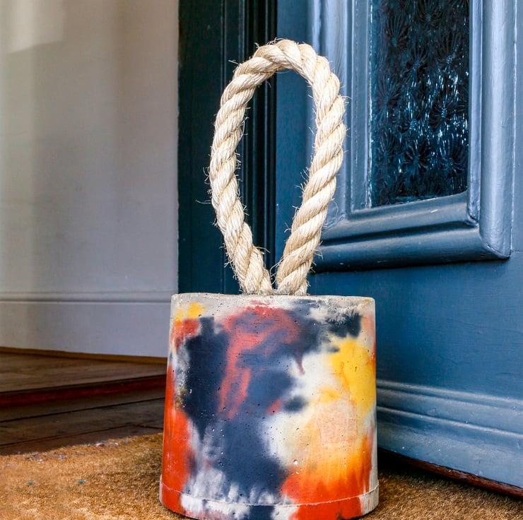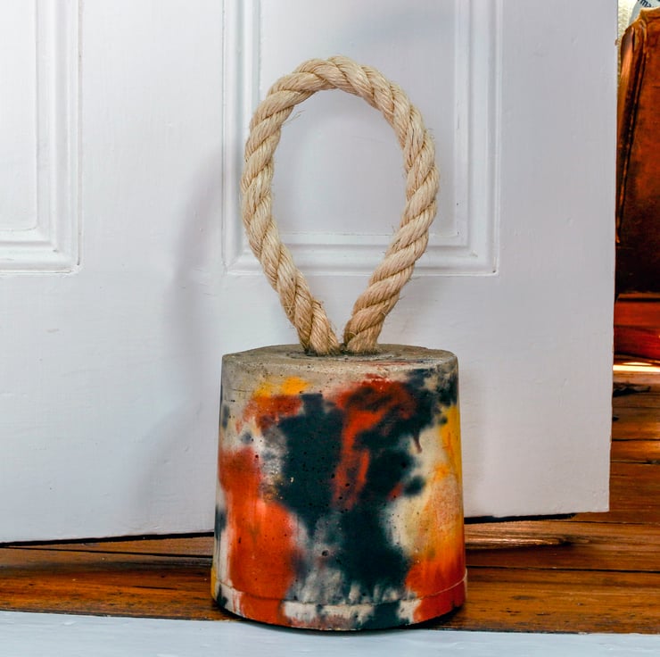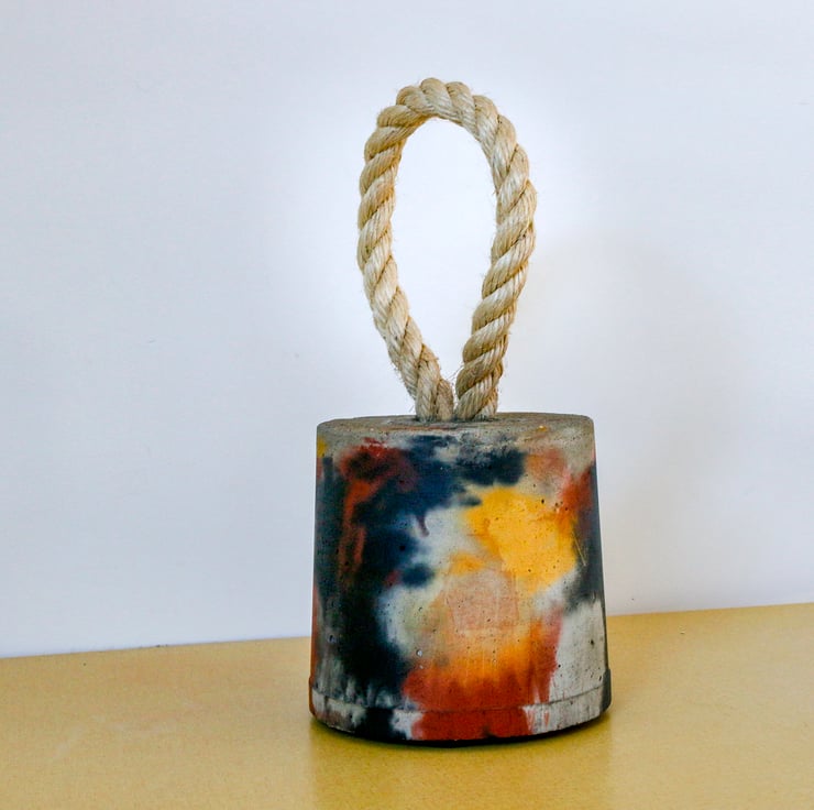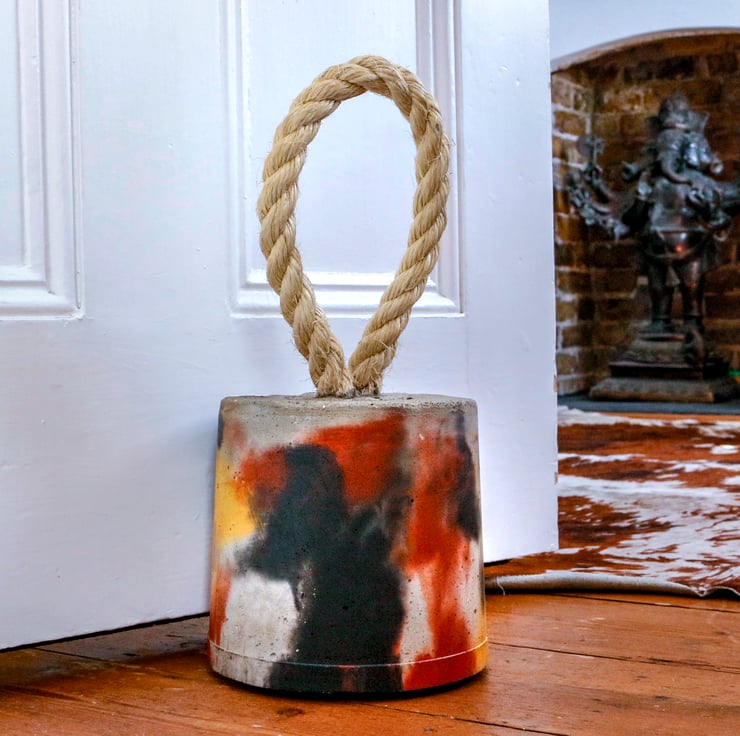 7.5 kg - 16.5 pounds door stop, each door stops has been individually cast used different coloured concrete, each door stops is unique and different, the door stop has four anti scratch pads underneath, the door stop comes with natural sisal rope, due to the hand casting process the door stops will have some small imperfection and markings. This door stop can be used indoors and outdoors.