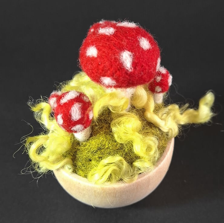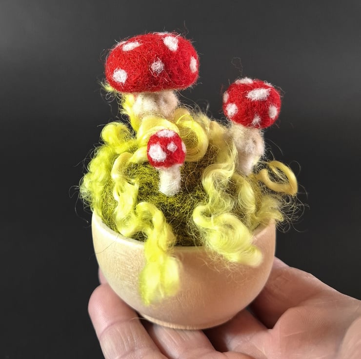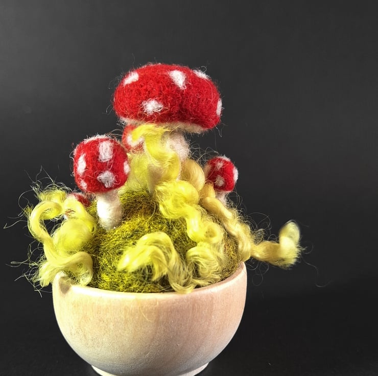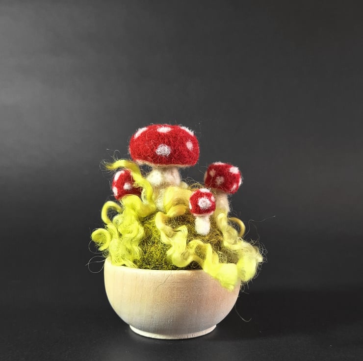 I handmade these adorable little toadstool mushrooms by needle felting, using 100% natural wool fibres. The cluster of five scarlet red toadstools are nestled in a bed of curly, light green moss (wool fibres) which sits upon a green mossy mound.