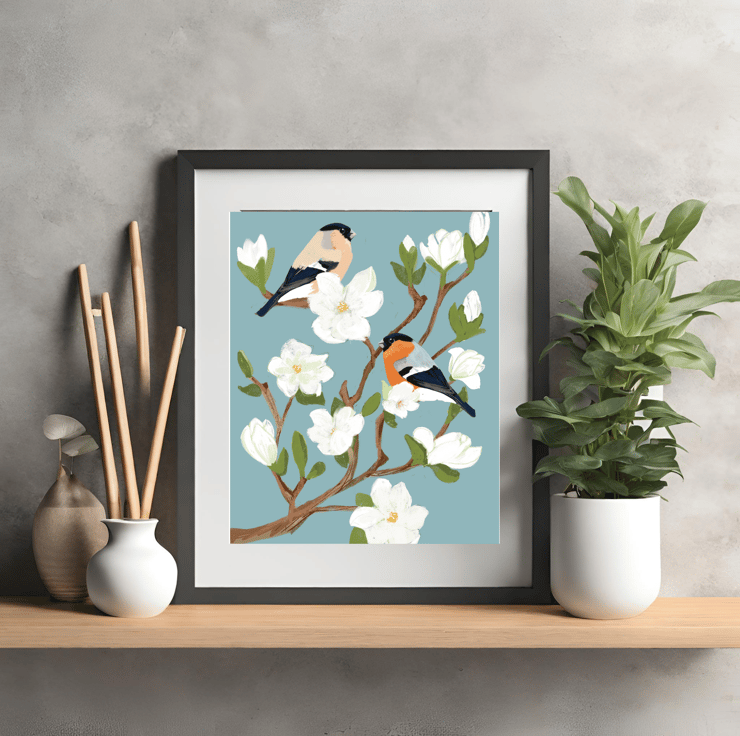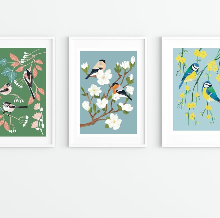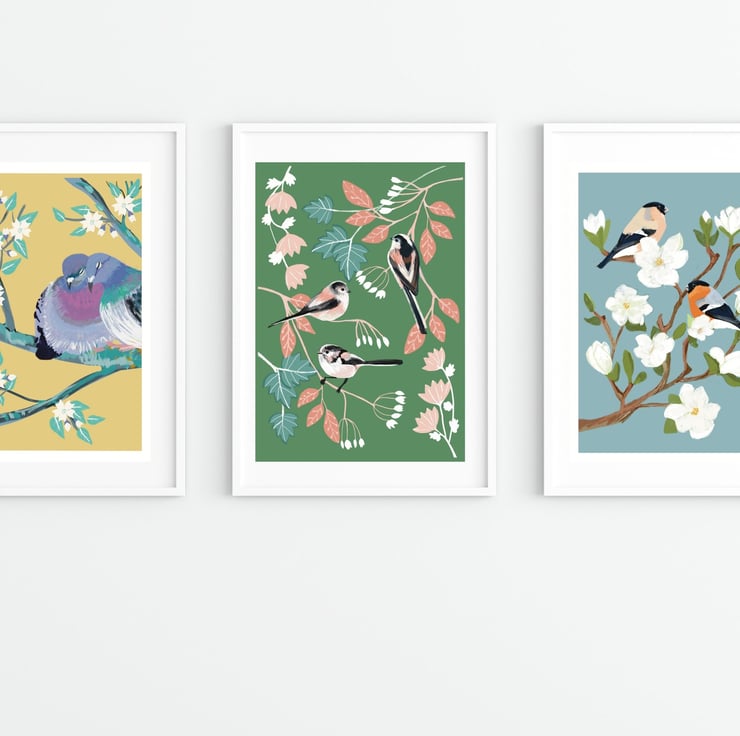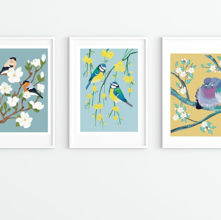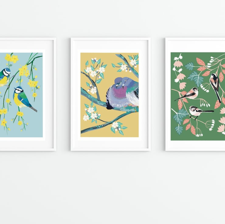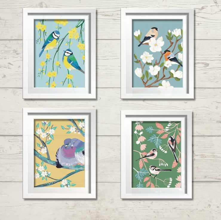 Birds & Blossoms Collection - 4 stunning beautiful bird prints. These beautiful art prints by The Hedgerow Artists are mounted with white top quality bevelled mounts and backboard. They fit in frames made for 8”x 10” prints you could also fit them in to frames with a mount to create a large double mounted picture.