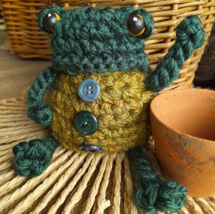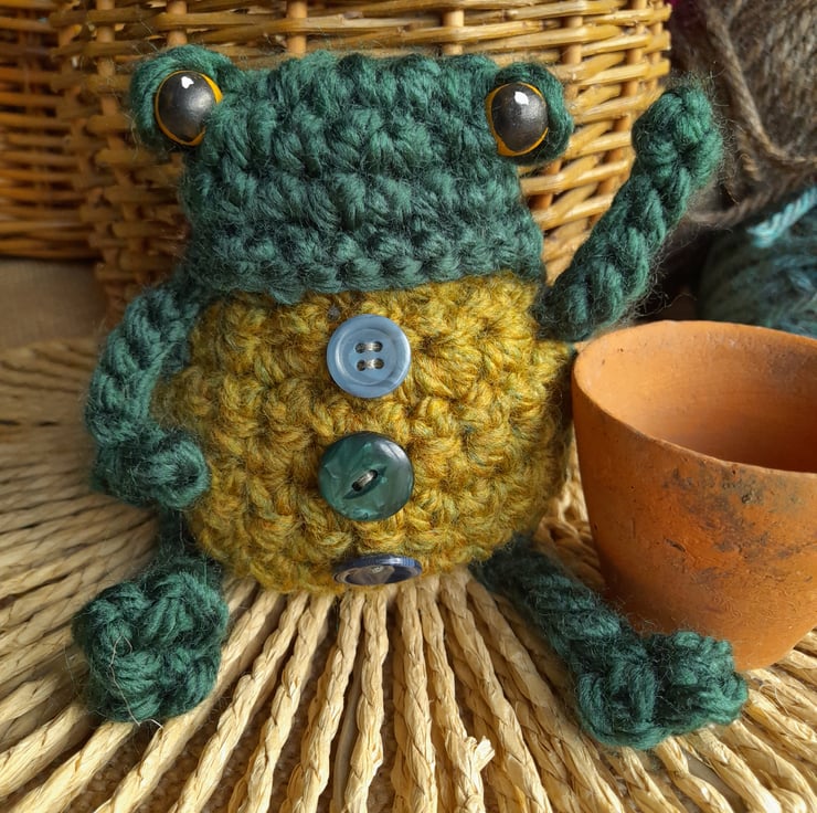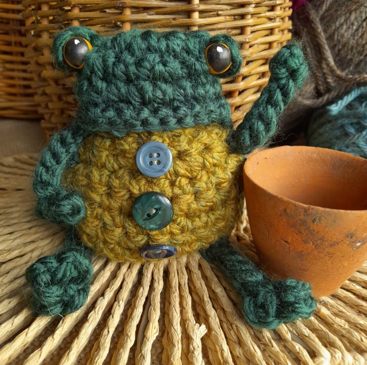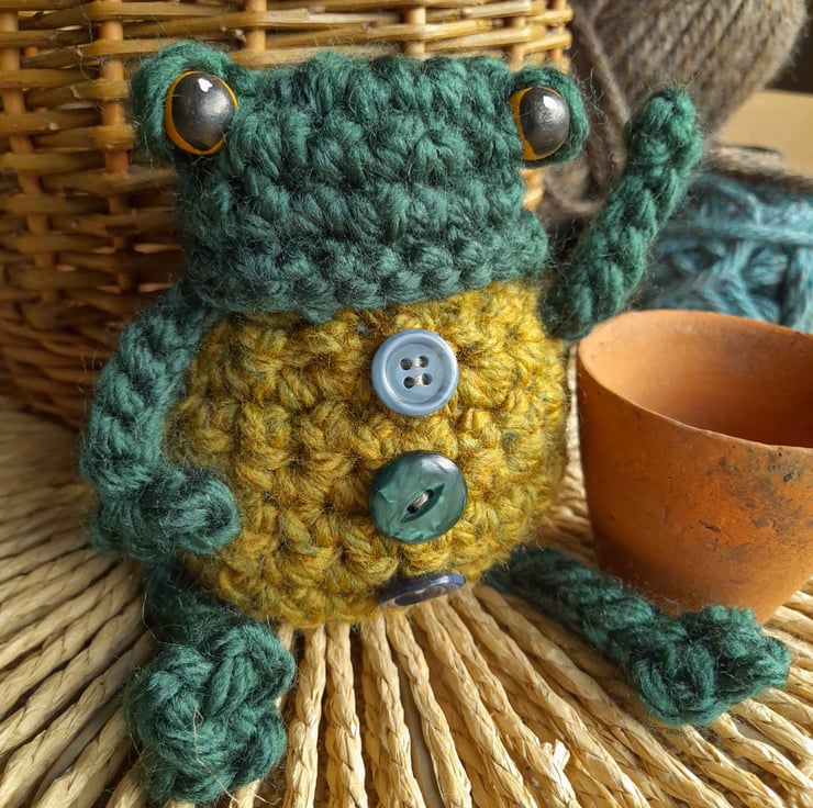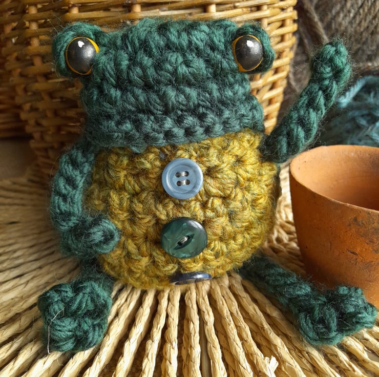 Looking for a touch of whimsy to brighten your home? Meet this one-of-a-kind, hand-crocheted frog. This charming frog is lovingly handmade from chunky yarn, complete with big, curious eyes that will warm any heart.