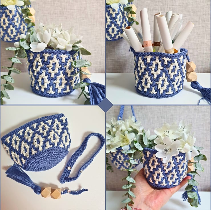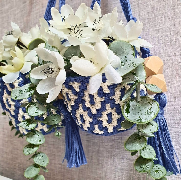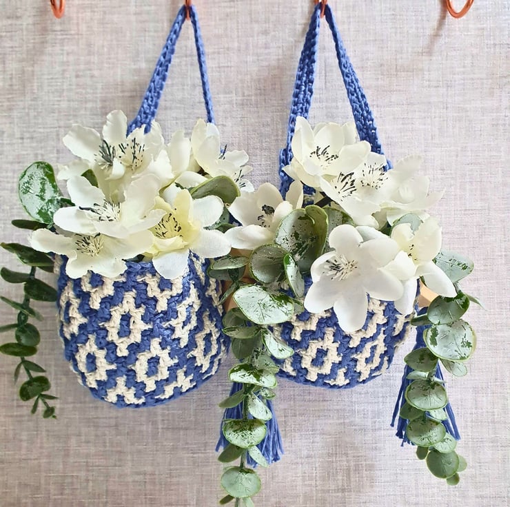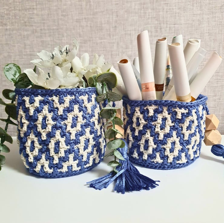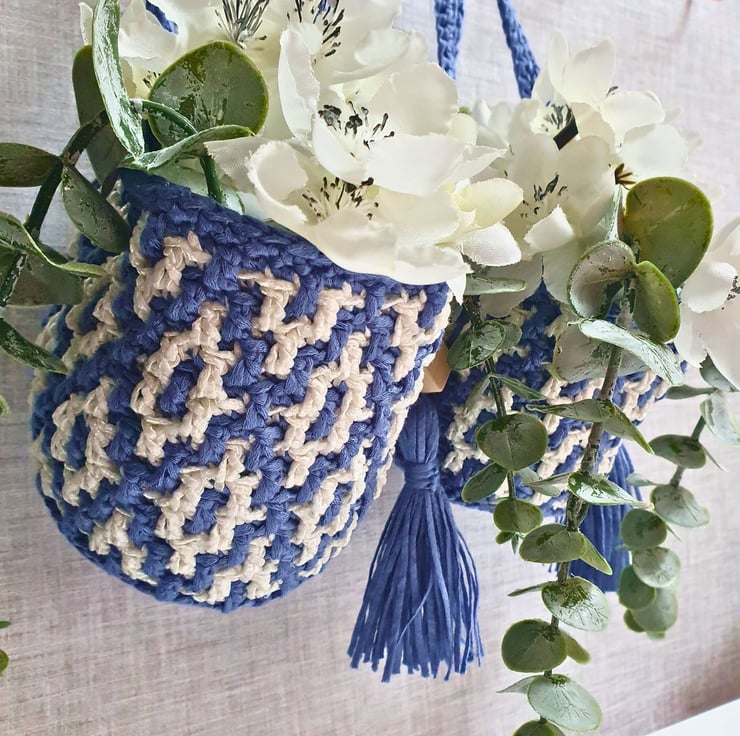 Set of two hanging baskets in blue & white, handmade with the mosaic crochet technique. Perfect for hanging on your wall and fill with artificial flowers, air plants & small flower pots, on your peg board filled with your craft tools and various bits & bobs, or just place them on your furniture & decorative shelf & use them to store all your small items. A practical & modern idea for your interior decor, or as a housewarming gift.