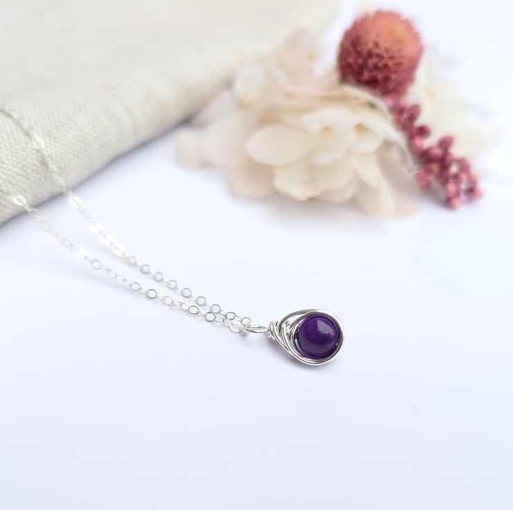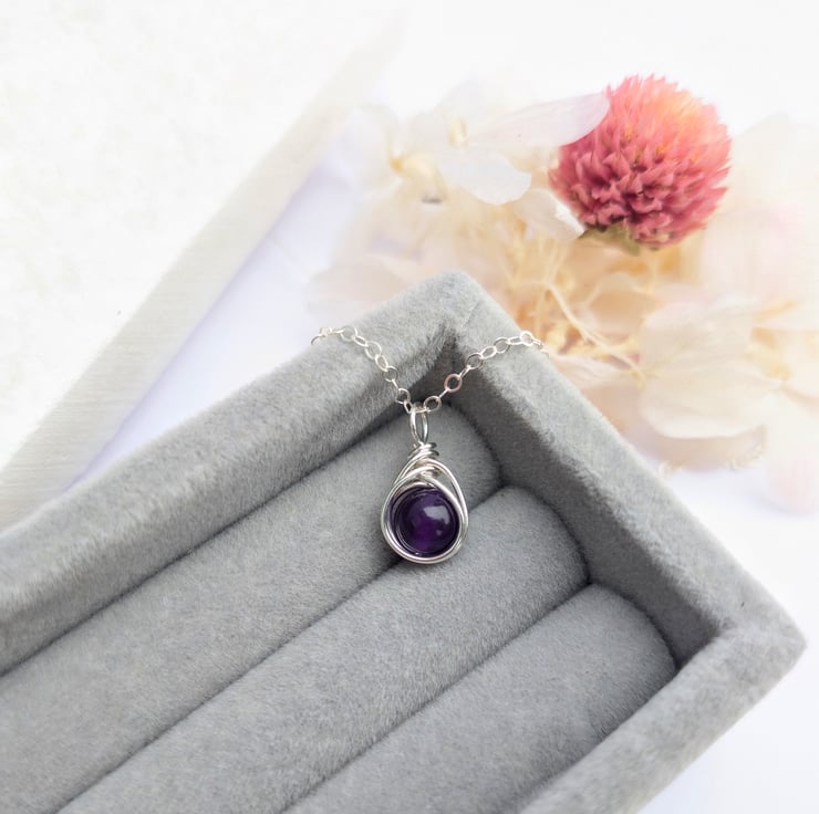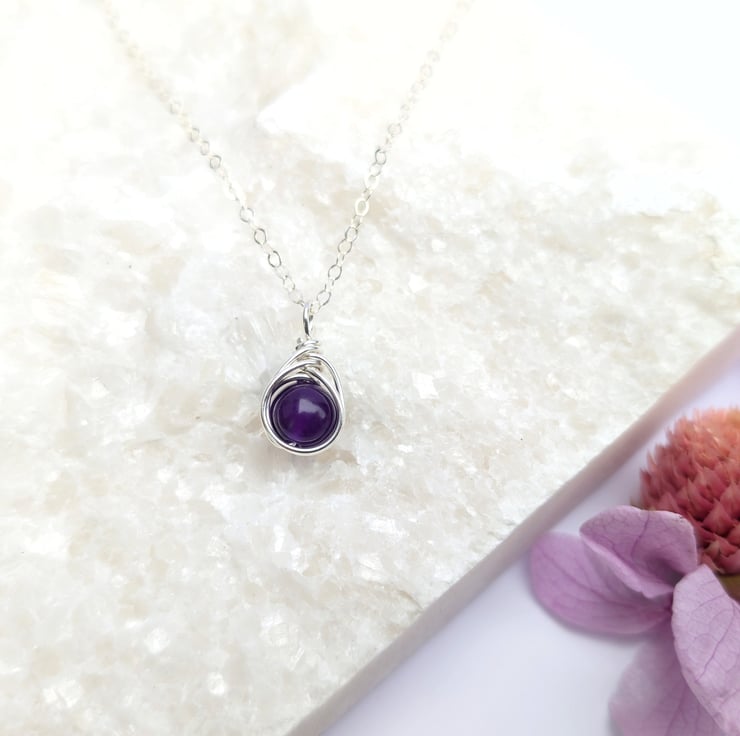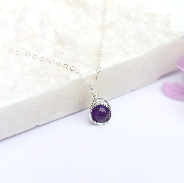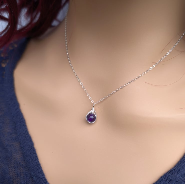 Delicate handmade sterling silver necklace featuring an amethyst natural gemstone bead. Designed with a minimalist touch, and perfect for layering. A simple lightweight wire wrapped amethyst pendant that is perfect for everyday wear. This dainty necklace would make a lovely gift for yourself or a loved one.
