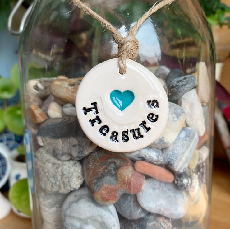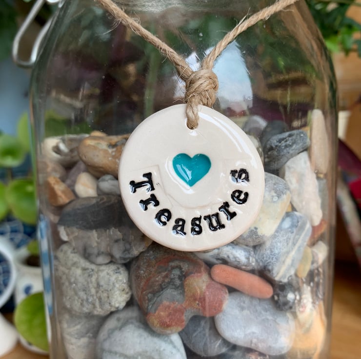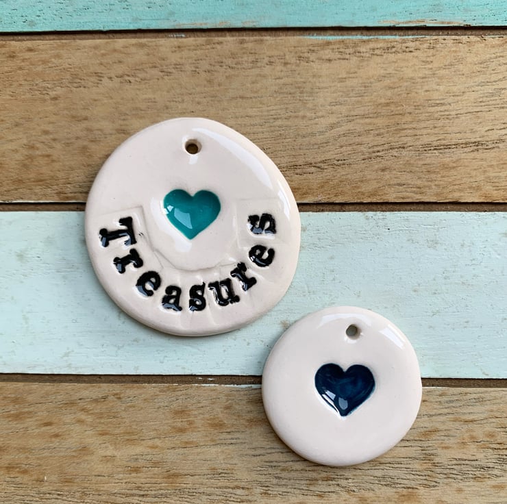 Hand made Ceramic Treasures Tag and a Turquoise Heart Tag. Set of 2 tags.