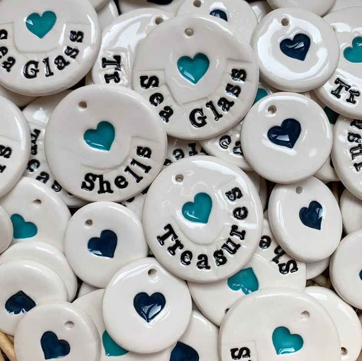 I cut out the tags, then I stamp the lettering and motif, they are allowed to dry, I then colour with underglaze and fire them in my kiln. Then I clean them up, glaze them and fire again in my electric kiln.