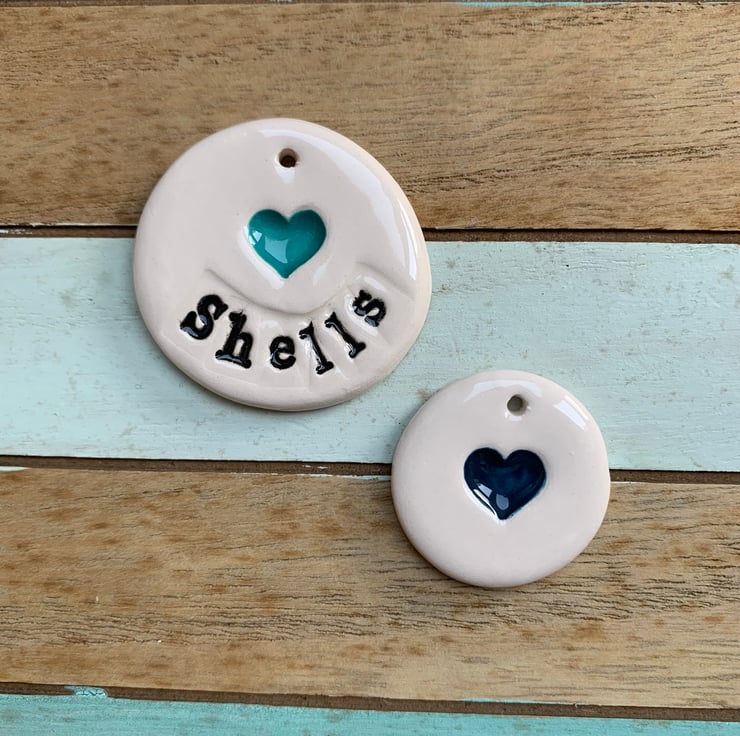 Hand made Ceramic Shells Tag and a Blue Heart Tag. Set of 2 tags.