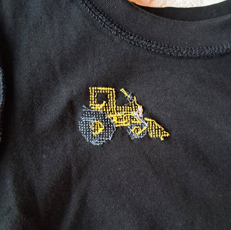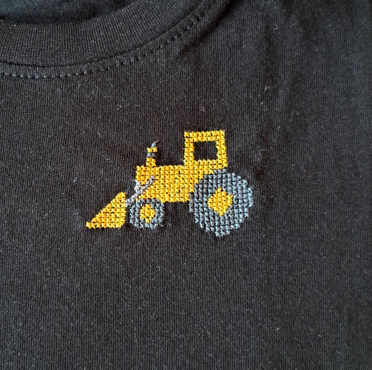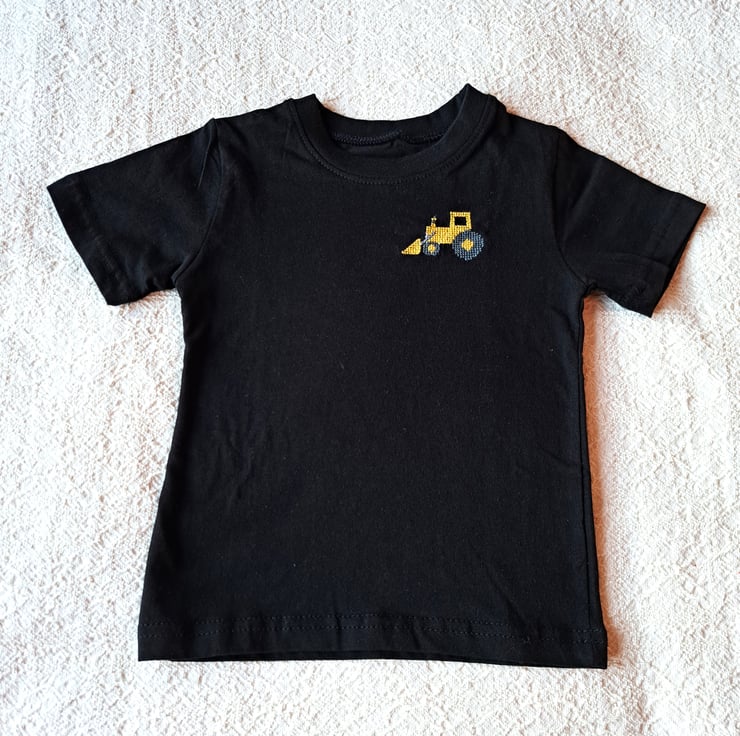 I have hand stitched a yellow digger on the left front of this black T-shirt age 2-3 years. As I never use a permanent backing material when hand embroidering kids' clothing, there is nothing inside to irritate your child's skin. The shirt has a round neck and short sleeves. It is all cotton, and can be machine washed.