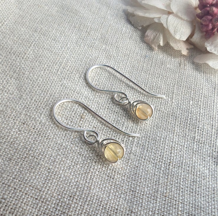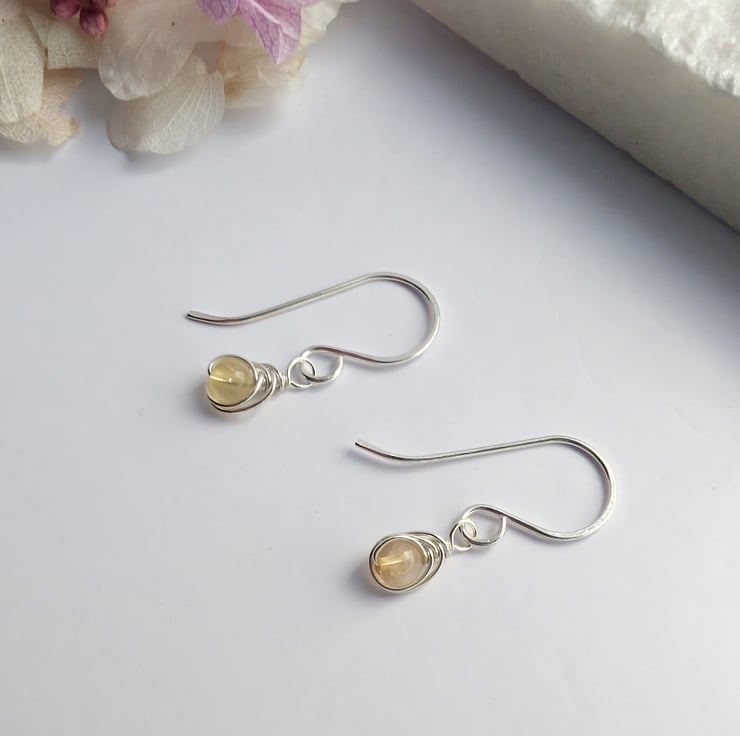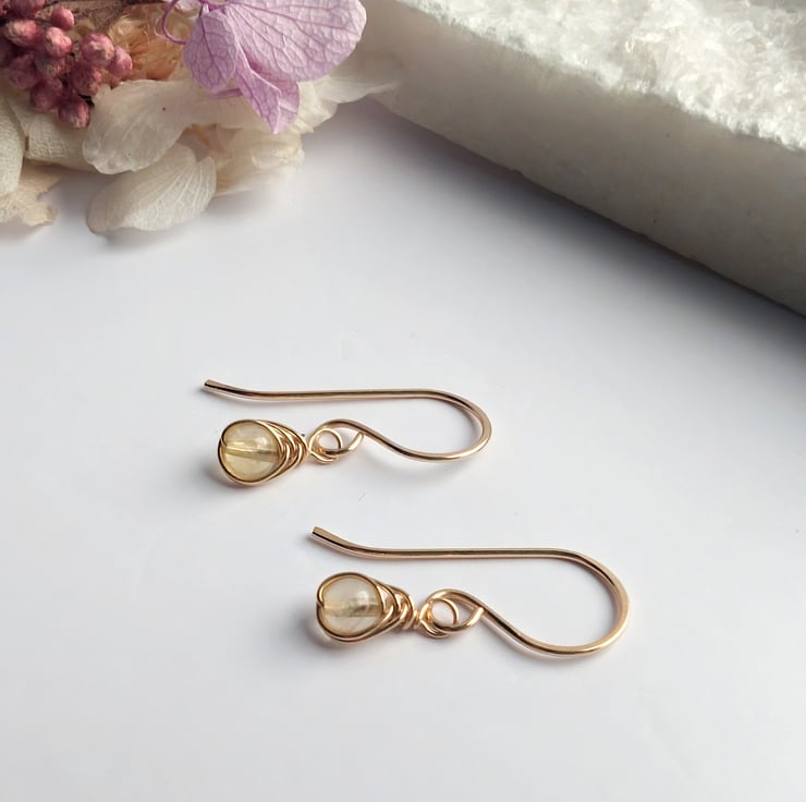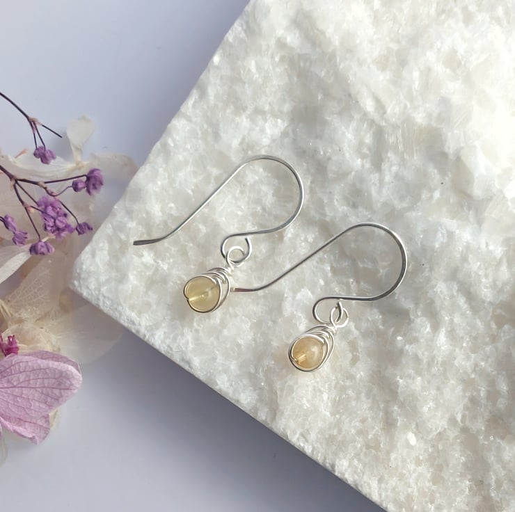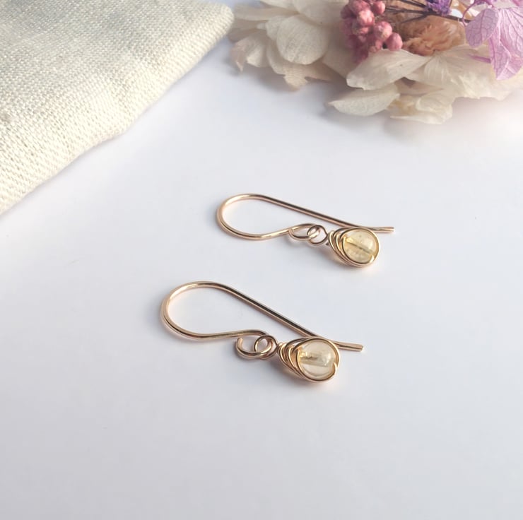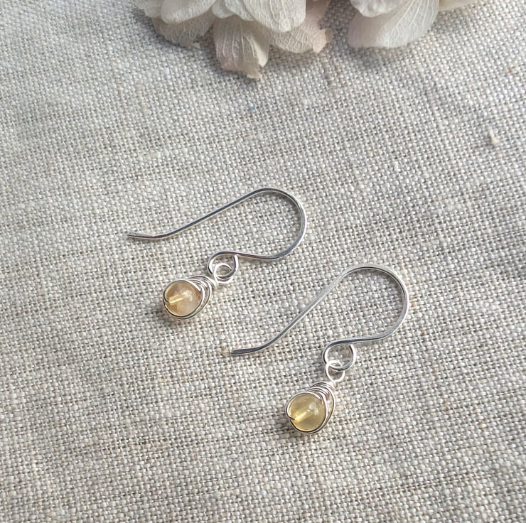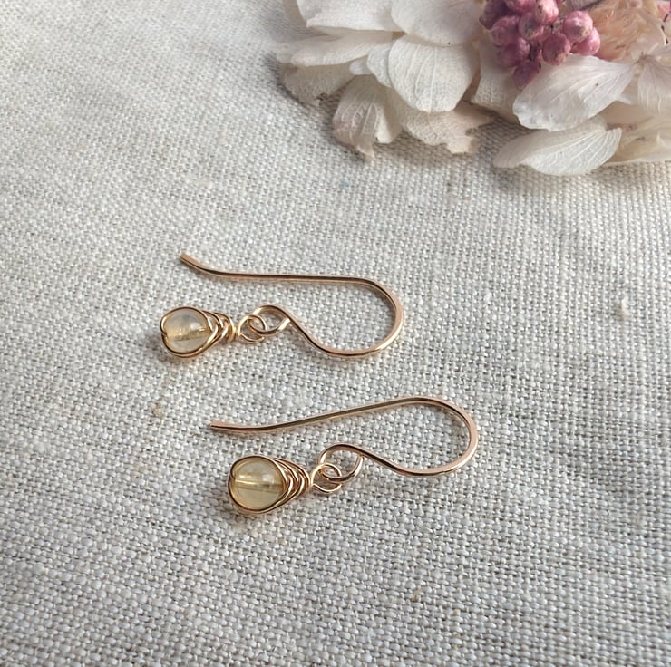 Dainty little dangle earrings featuring citrine gemstone beads. Small citrine beads wire wrapped in a herringbone weave to form a frame around the gemstones. These earrings would make a lovely gift for yourself or a loved one.