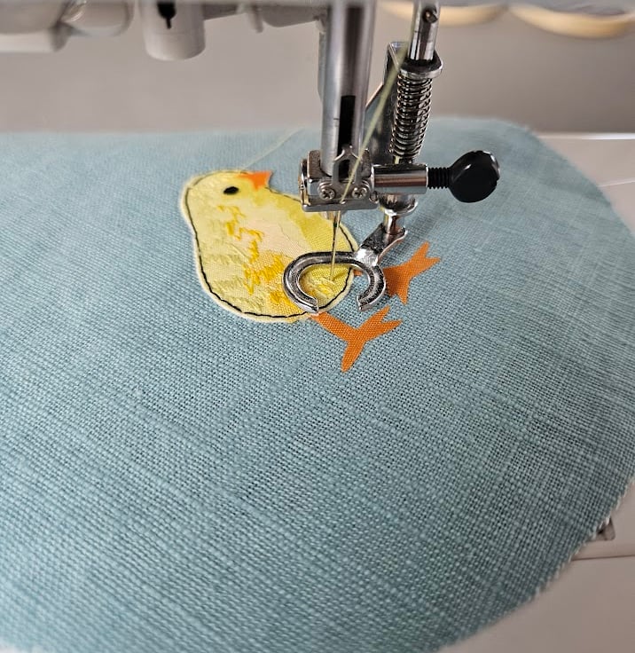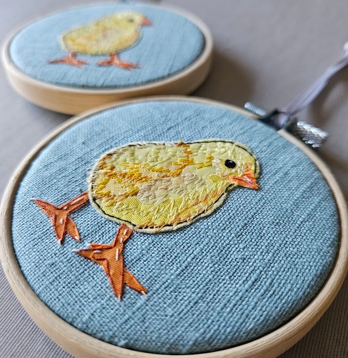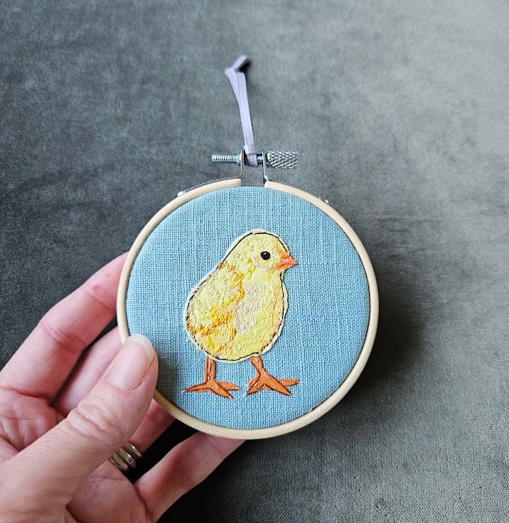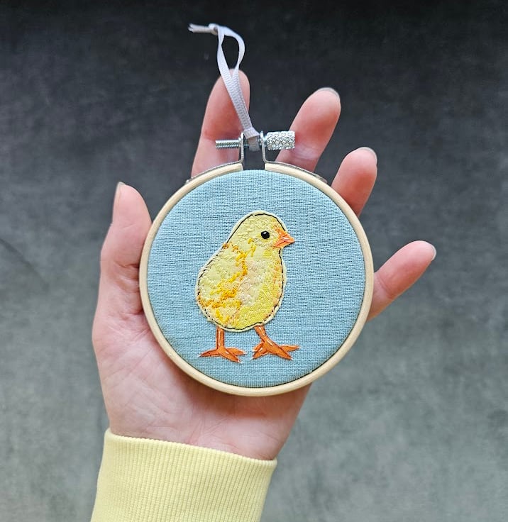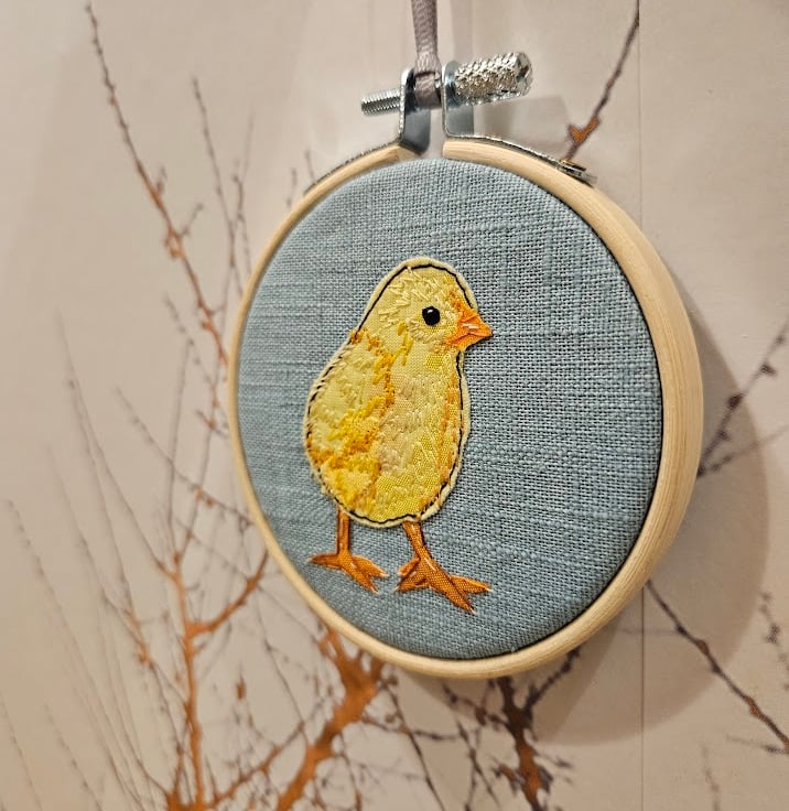 Handmade Easter Chick mini hoop (hanging decoration) on turquoise linen fabric.