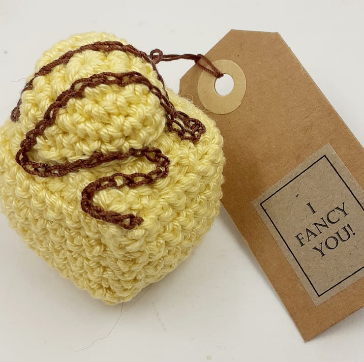 This crocheted French Fancy cake is perfect for telling someone you're sweet on them! It is made from 100 % cotton yarn and filled with polyester stuffing. The chocolate squiggle is sewn in fine cotton. The tag reads 'I fancy you!' on one side and is blank on the other for your own message. It measures approximately 6 cm tall by 4 cm. It comes with a flat -packed gold foil favour box and can be posted to you in a PIP ( Postage in Proportion ) box all of which means it can be sent at the large letter rate rather than as a small parcel - the cake will simply need a little plumping up on arrival!