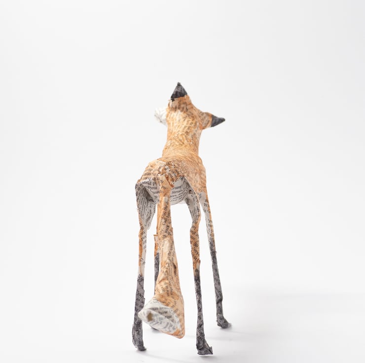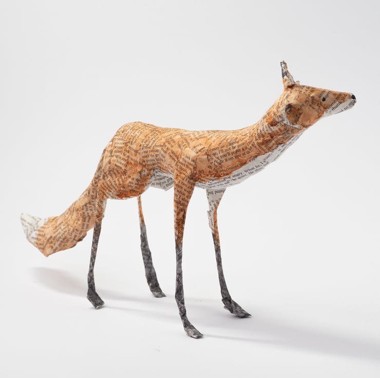 A handmade paper mache folk art sculpture of a large standing fox. It is created from paper mache using book paper, wire and watercolour and is approx 18cm high x 28cm long. Made with newspaper, wire, glue, pages from Shakespeare, and watercolour paint.
