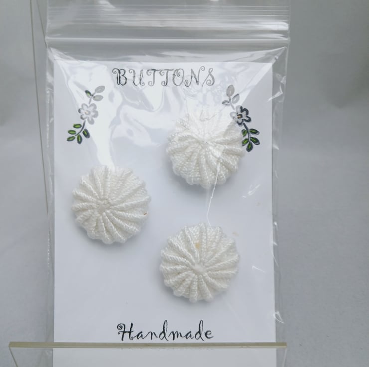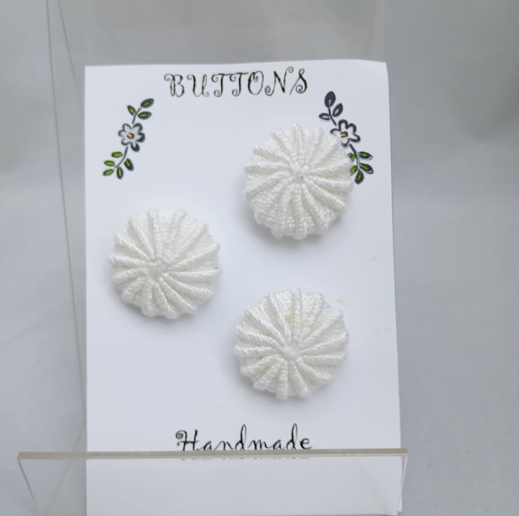 Handmade Embroidered Yorkshire Style Covered Buttons. White in colour. These Handmade Buttons have been embroidered using Perle Cotton Thread. Tightly Covered over a plastic button mold. Washable on a gentle wash
