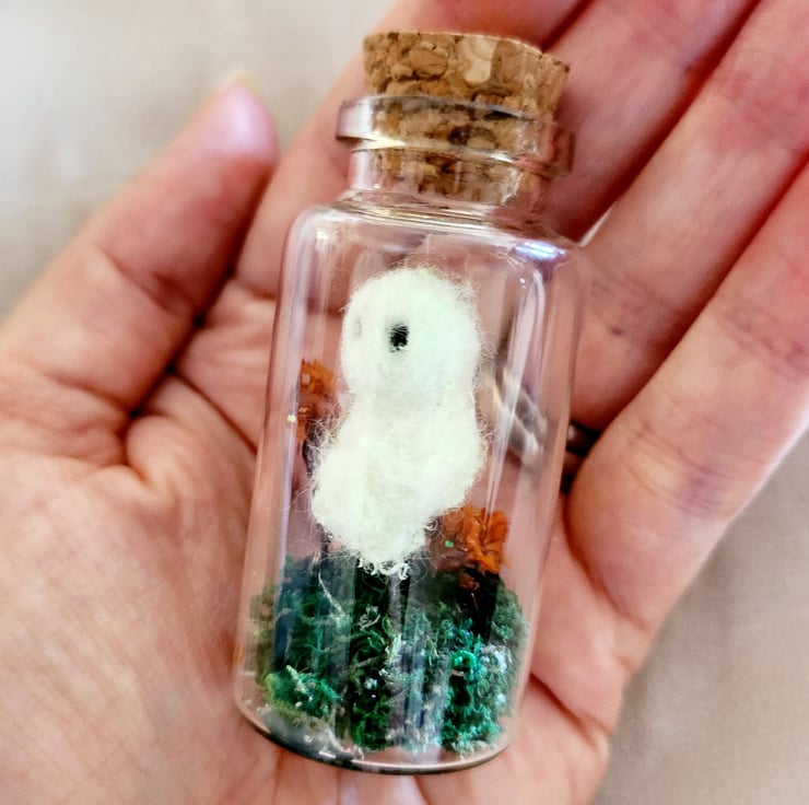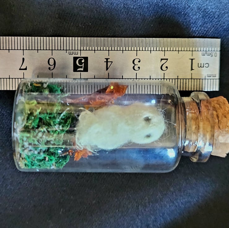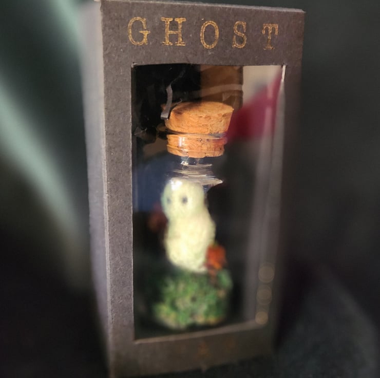Your very own glow in the dark pet ghost. Encased in its own glass jar with real dried flowers and moss. Completely hand made. Ghost is needle felted.