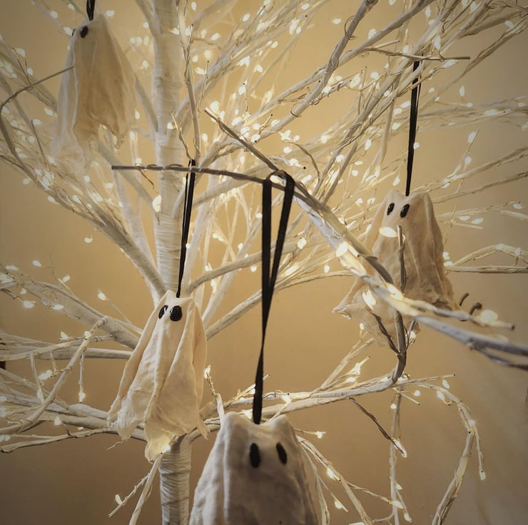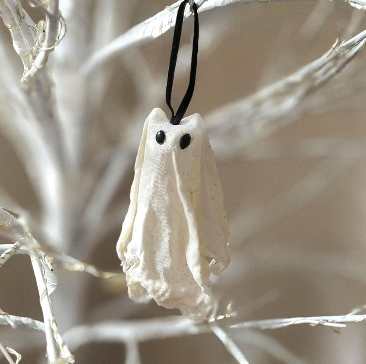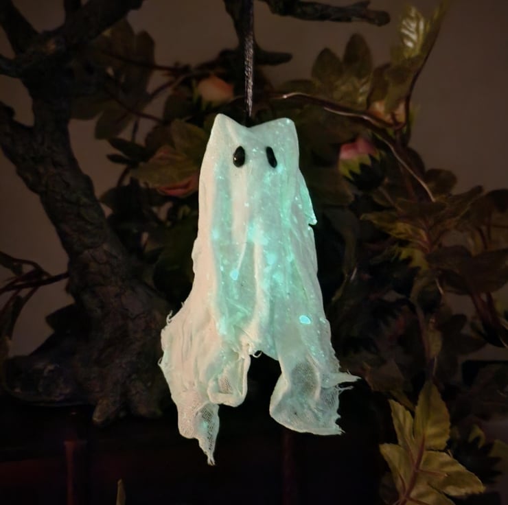 Each ghost is completely handmade from organic muslin cloth, with black ribbon tie. Each is speckled with UV glow in the dark pigment to give them that extra spooky glow.