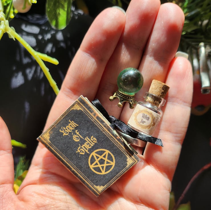 Spell book is filled with spells and witchy knowledge. Tiny wish jar with instructions that you can use, gaze into the mini crystal ball.