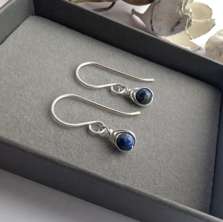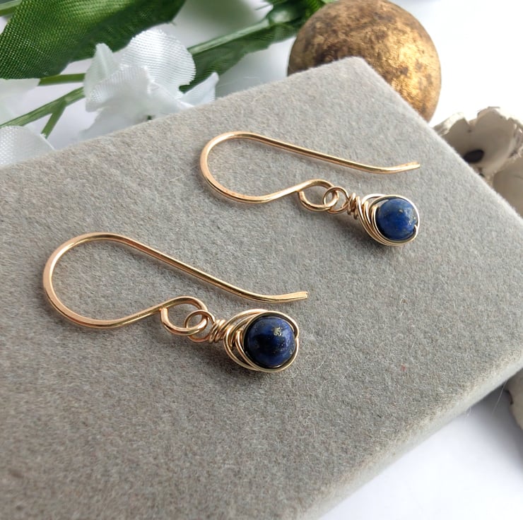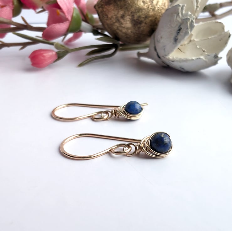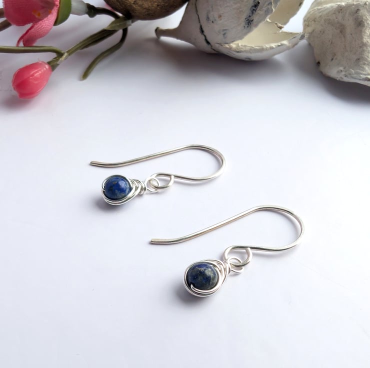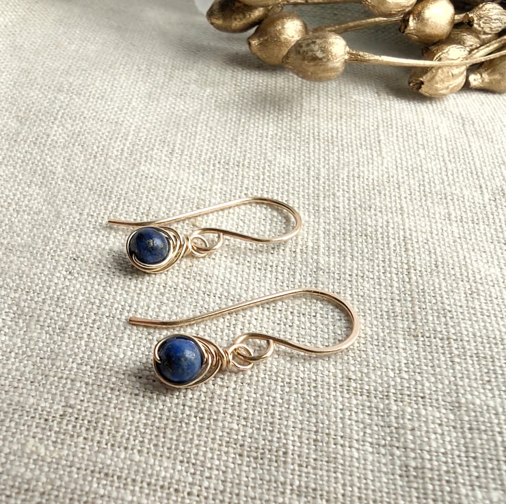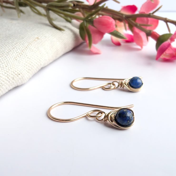 Dainty little dangle earrings featuring lapis lazuli gemstone beads. Small lapis beads wire wrapped in a herringbone weave to form a frame around the gemstones. These earrings would make a lovely gift for yourself or a loved one.