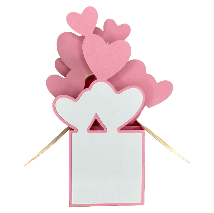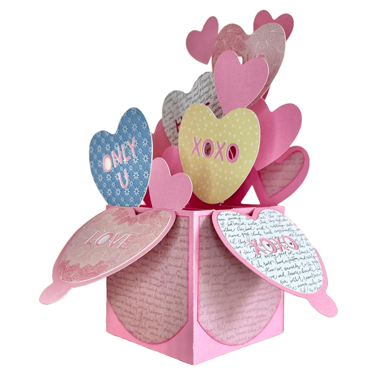 As the recipient opens the card, a charming three-dimensional scene springs to life. Crafted in the shape of a box, the card revealed a burst of heart-shaped cutouts, each adorned with unique patterns and vibrant colors. The intricate designs and playful messages made the card a captivating and visually appealing way to express affection.