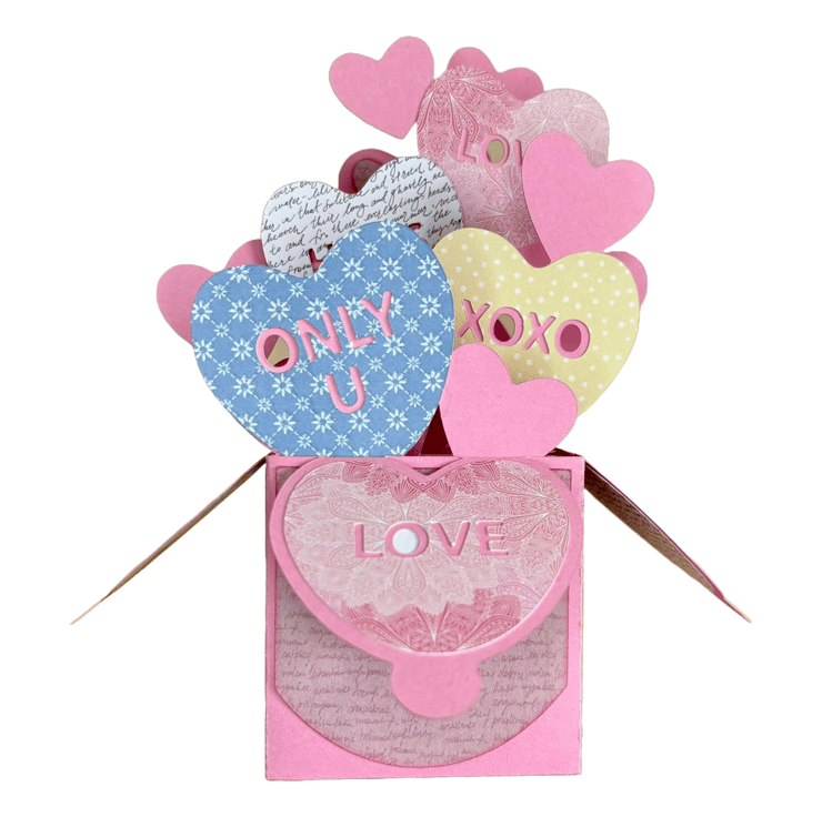 The front of the box featured a large pink heart with delicate patterns and the word "LOVE" cut out in the center. Above this heart, other hearts with diverse designs and messages added to the festive display. A blue heart with a white floral pattern and the words "ONLY U" cut out, a yellow heart with a polka dot pattern and the word "XOXO" cut out, and several other pink and white hearts with messages of love created a delightful and heartwarming scene.