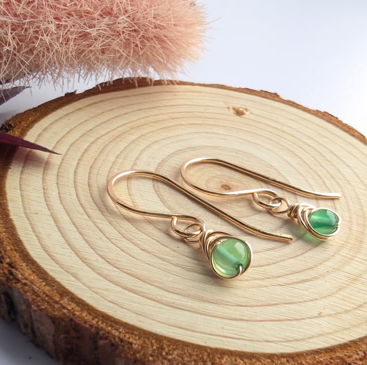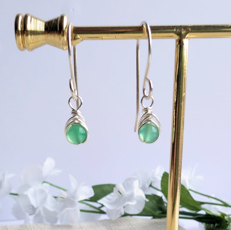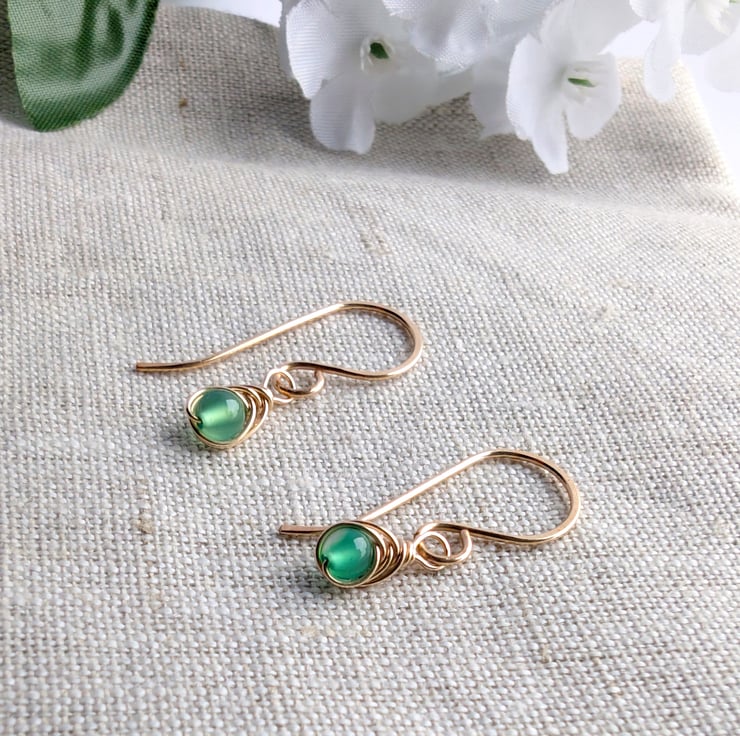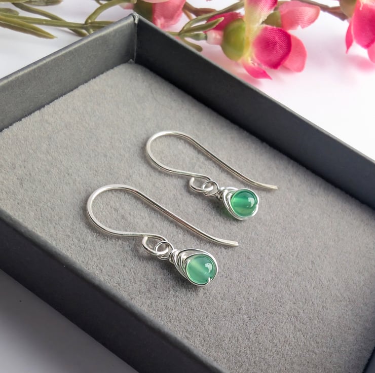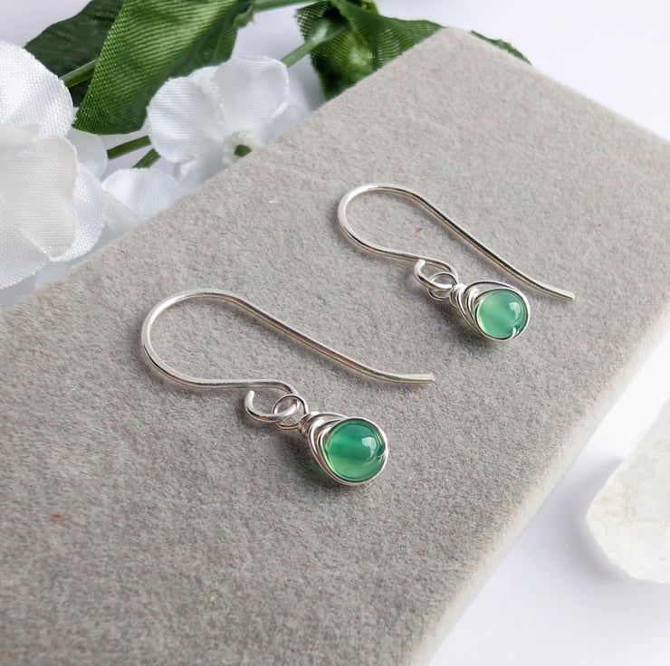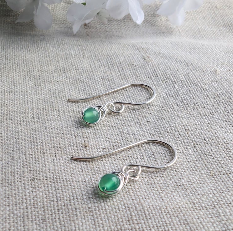 Dainty little dangle earrings featuring green onyx gemstone beads. Small green onyx beads wire wrapped in a herringbone weave to form a frame around the gemstones. These earrings would make a lovely gift for yourself or a loved one.