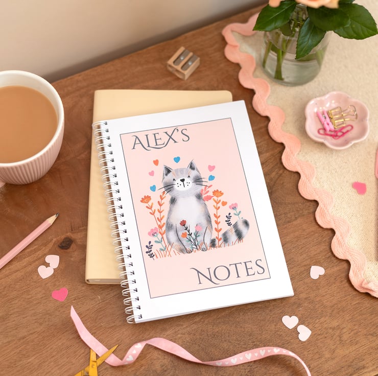 Our Personalised A5 Notebook featuring a cute Cat is a perfect blend of style and functionality. Featuring 40 high-quality lined pages on 120gsm paper, this handmade notebook offers a premium writing experience.