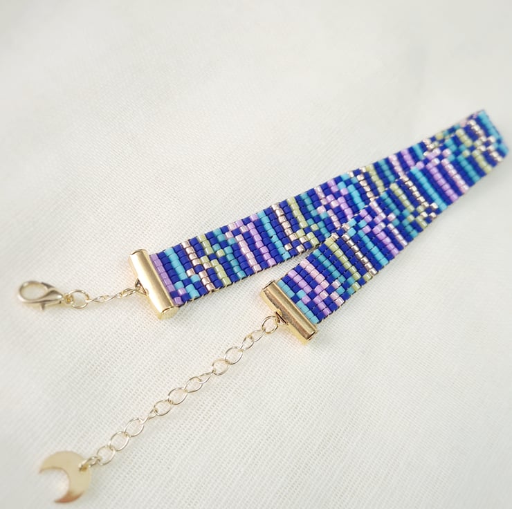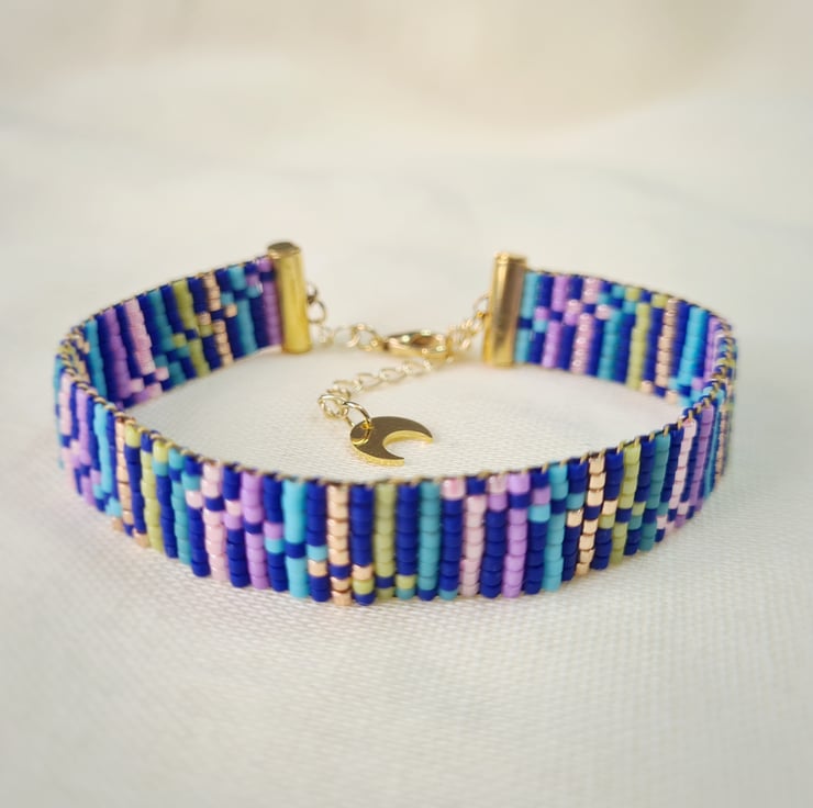 The bracelet is weaved on a bead loom using strong, nylon thread. It is held together with gold plated end tubes and finished with an extender chain, lobster clasp and crescent charm. It also comes with a cute handmade pouch to store it in.
