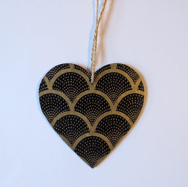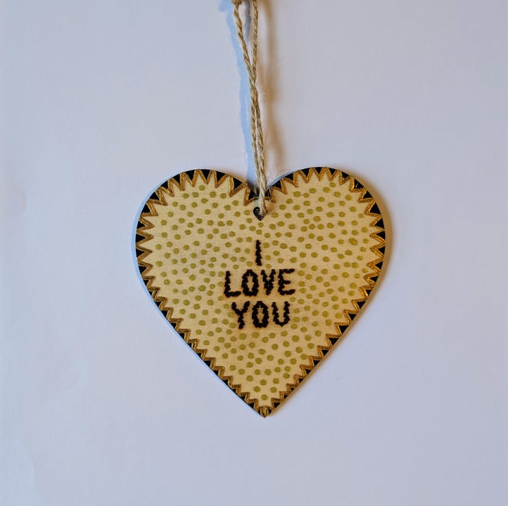Measuring approximately 10cm x 10cm, this unique design features the phrase 'I Love You' created with intricate heart-shaped details which is laser-printed onto wood. This heart is hand painted and decoupaged with a stunning black and gold Art Deco- inspired pattern.