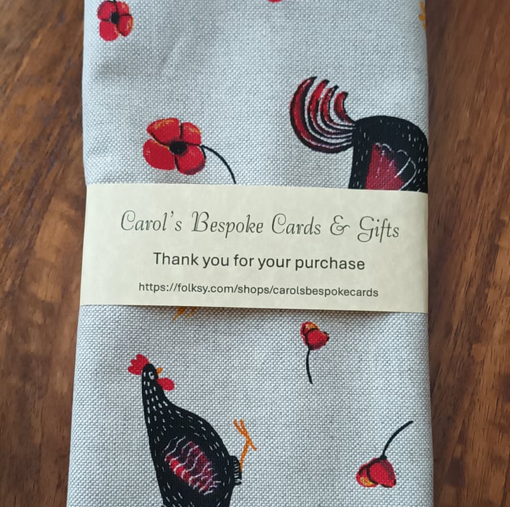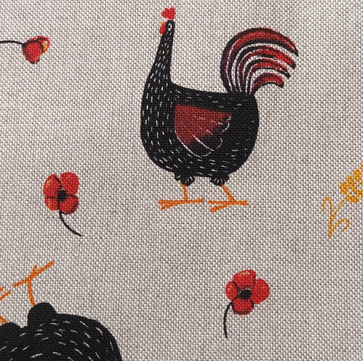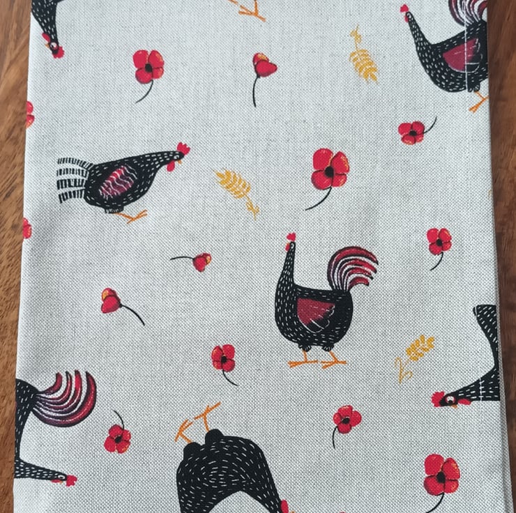 Black Speckled Hen And Red Poppy Tea Towel. Natural Linen look. Free Delivery.