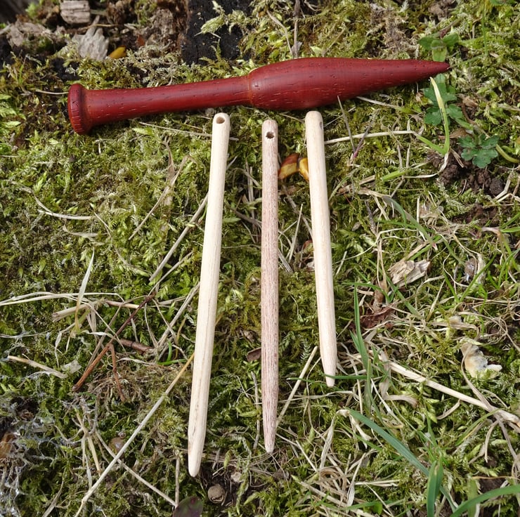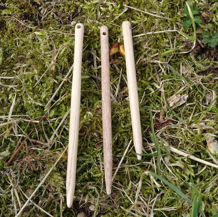 The needles are, roughly 6mm thick, 140, 120 or 95mm long. There will be variations in the sizes as I make them by eye rather from any kind of template.