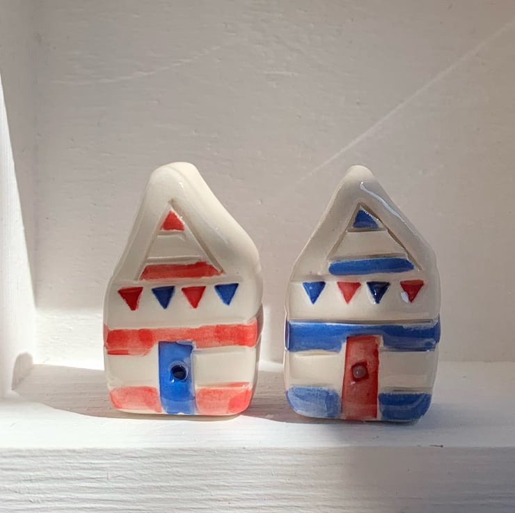 I make the huts, they are allowed to dry, I then colour with underglaze and fire them in my kiln. Then I clean them up, glaze them and fire again in my electric kiln.