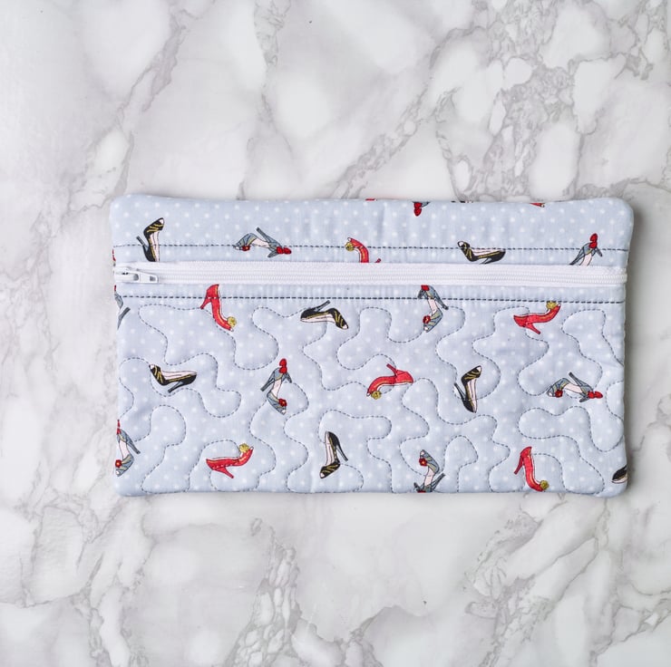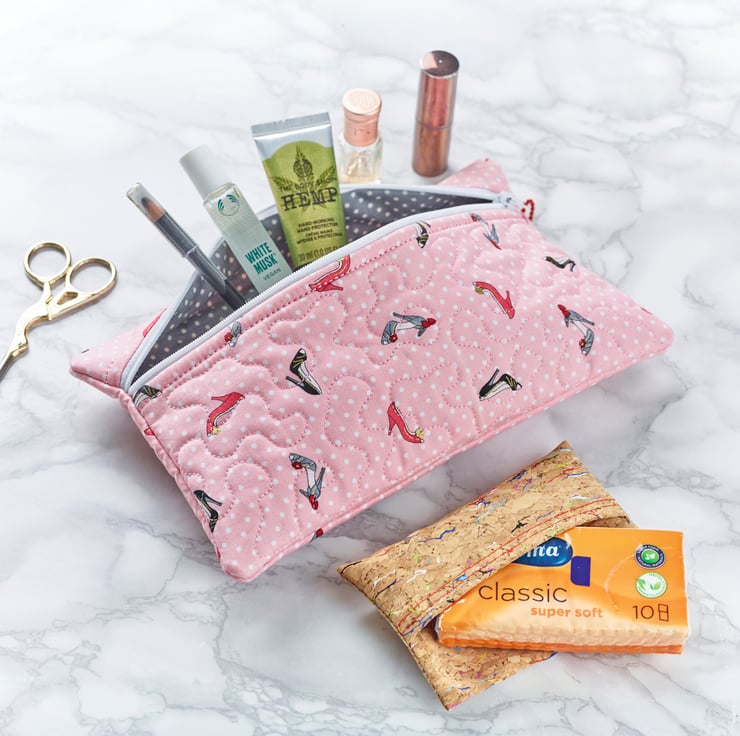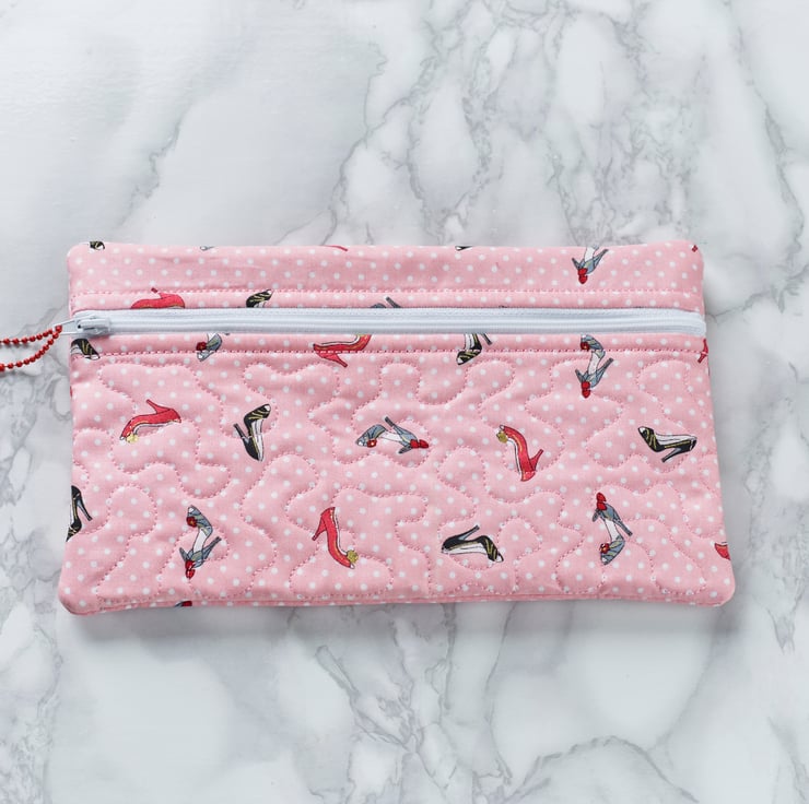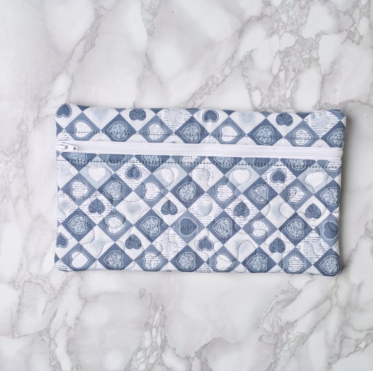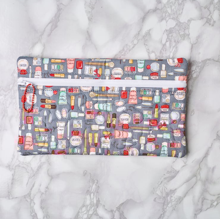 Machine embroidery quilted cosmetic pouch. Suitable as a gift all year round. Both outer and inner fabrics are 100% cotton.