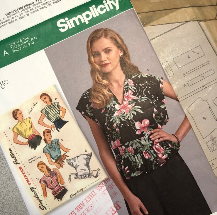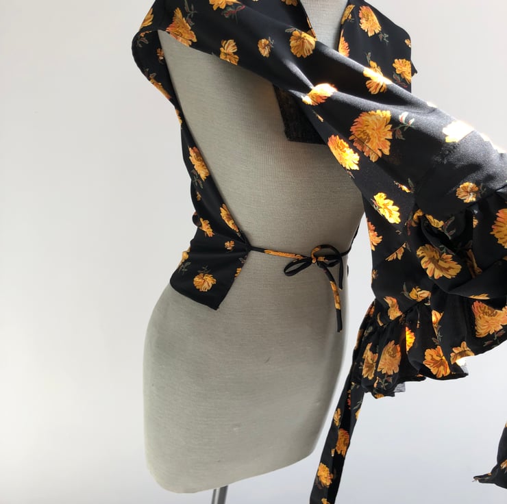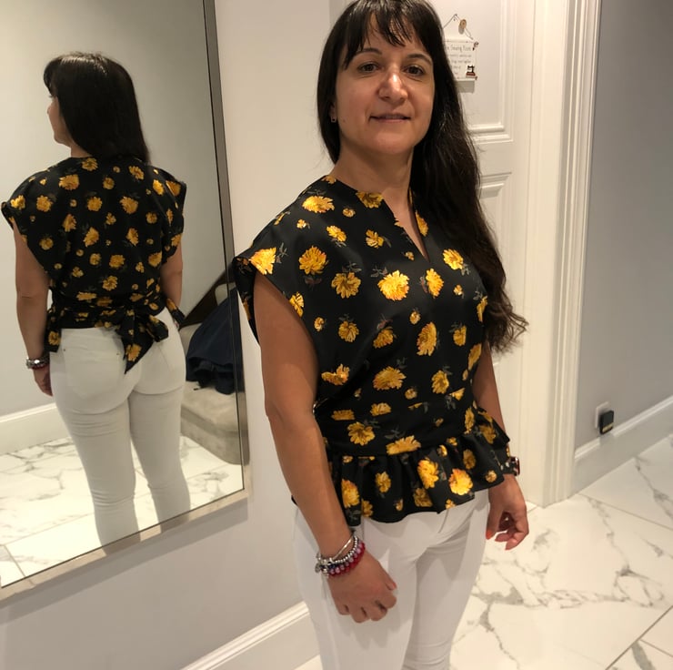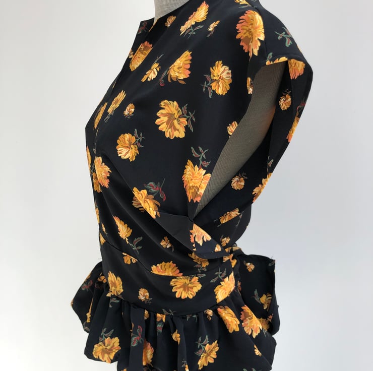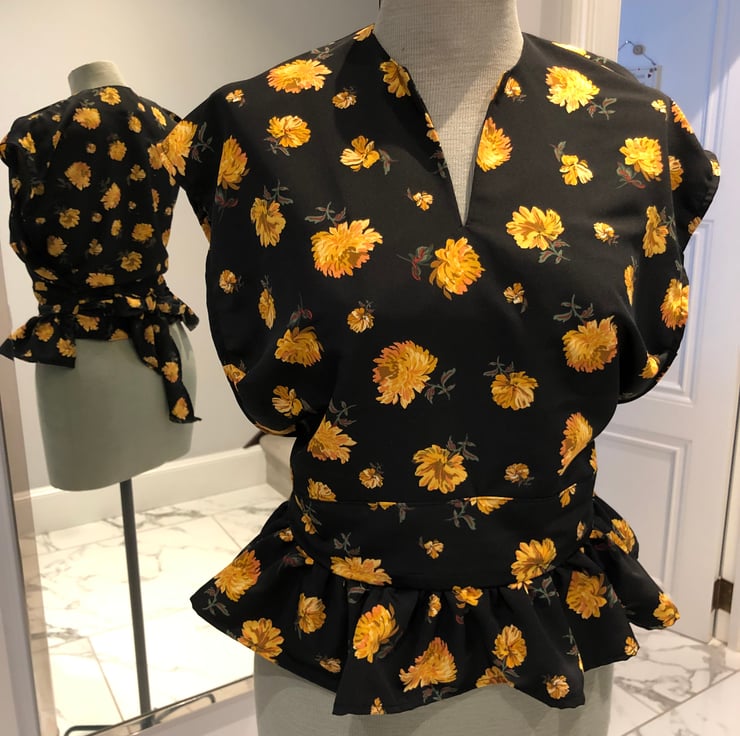 Elegant blouse made with floral printed design on a lightweight crepe fabric. I used ventage patten. Black top with yellow- orange flowers looks stylish, limited creasing and easy wash.