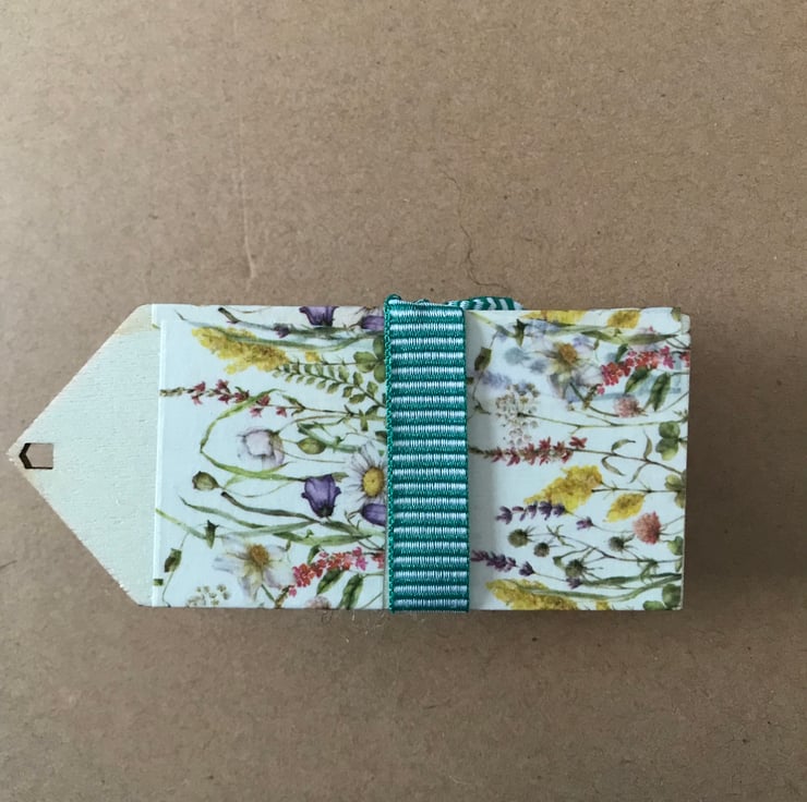 Presented on a decorated wood tag , attached with a green ribbon.