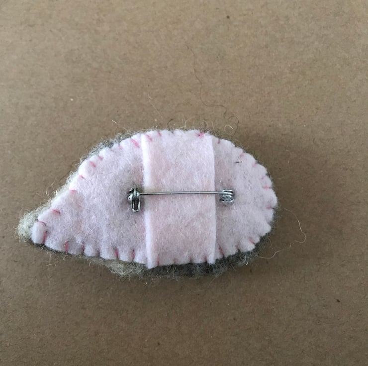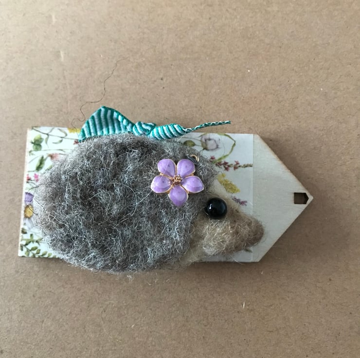 Sweet little felted hedgehog brooch with a flower charm.