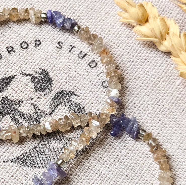 It features beautiful purple-blue Tanzanite gemstone chips, warm Peach Zircon gemstone chips, frosted Czech glass, and sparkly sterling silver accents.