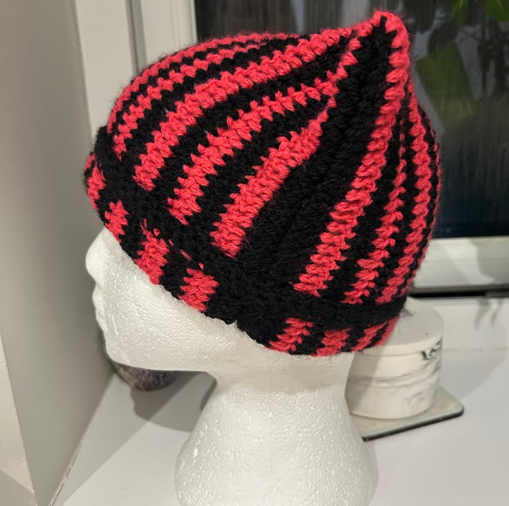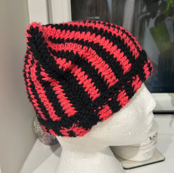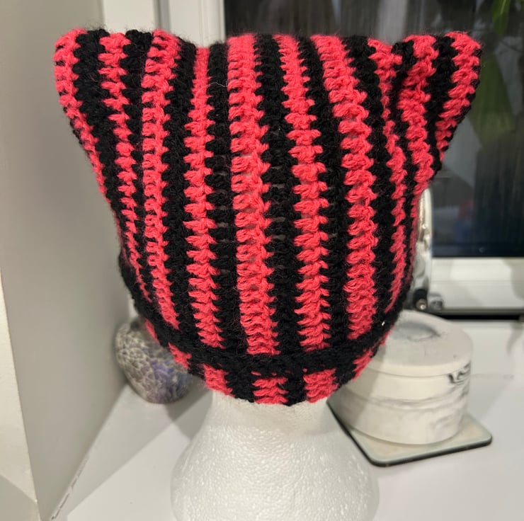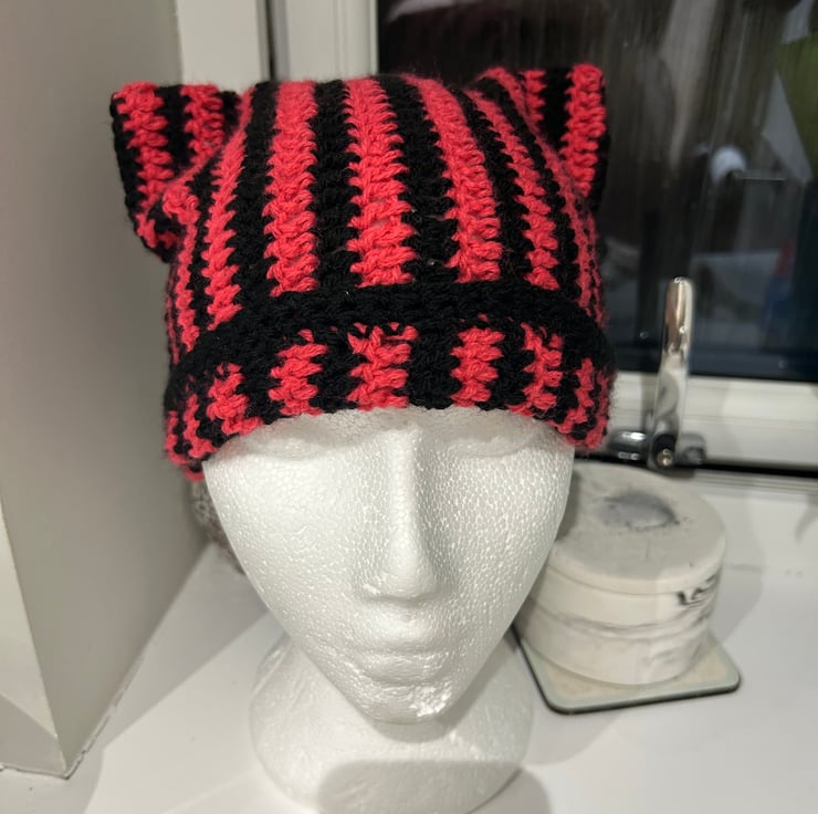 Hand crocheted, unique, one of a kind cat ear beanie hat. Made with acrylic yarn. Soft, thick and cosy. Smoke and pet free home.