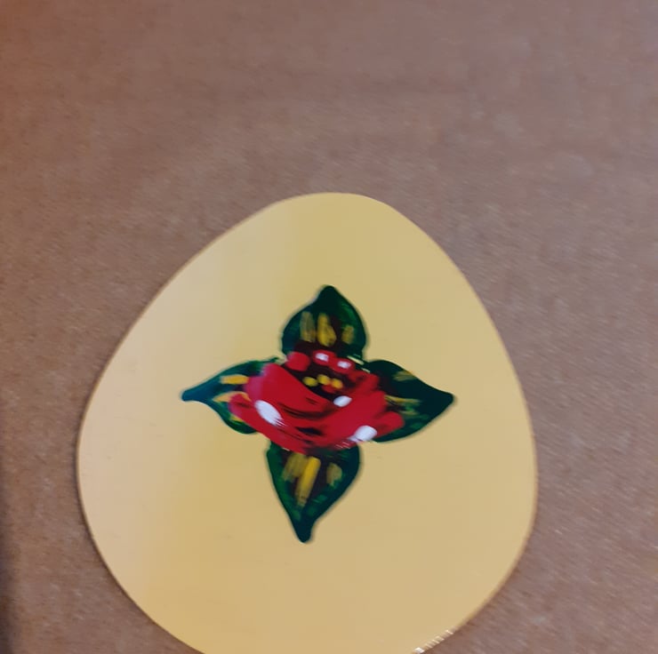 A wooden egg shaped magnet that has been painted yellow. It has a red canal art style rose painted on it.