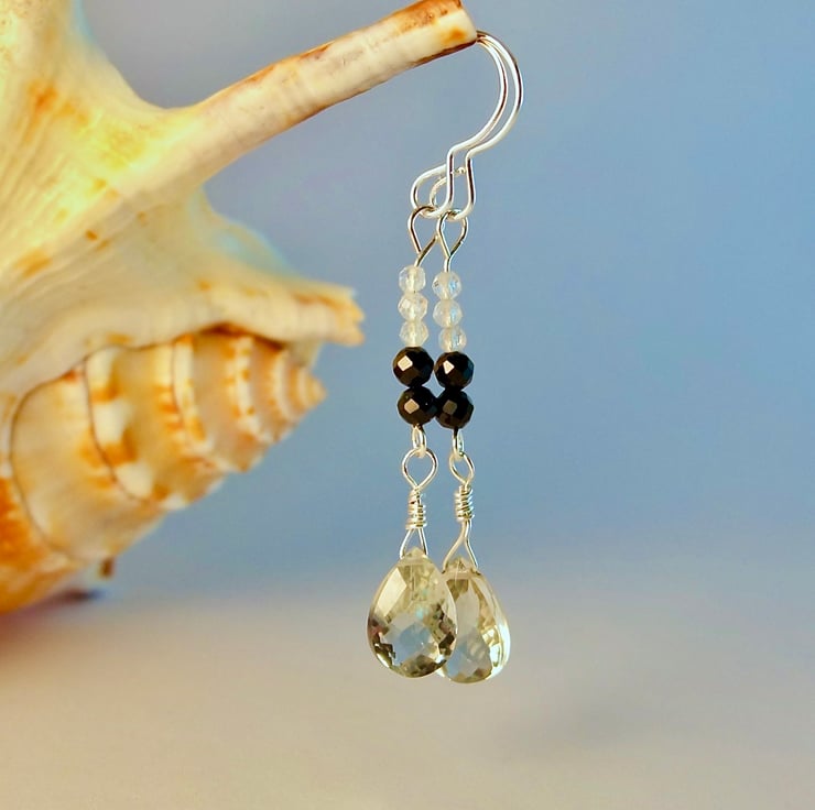 Each earring features a 12x7mm AA faceted Green Amethyst teardrop attached by sterling silver wire below a pair of 3mm AAA grade faceted black Spinel topped with a trio of 2mm AA grade faceted White Topaz beads.