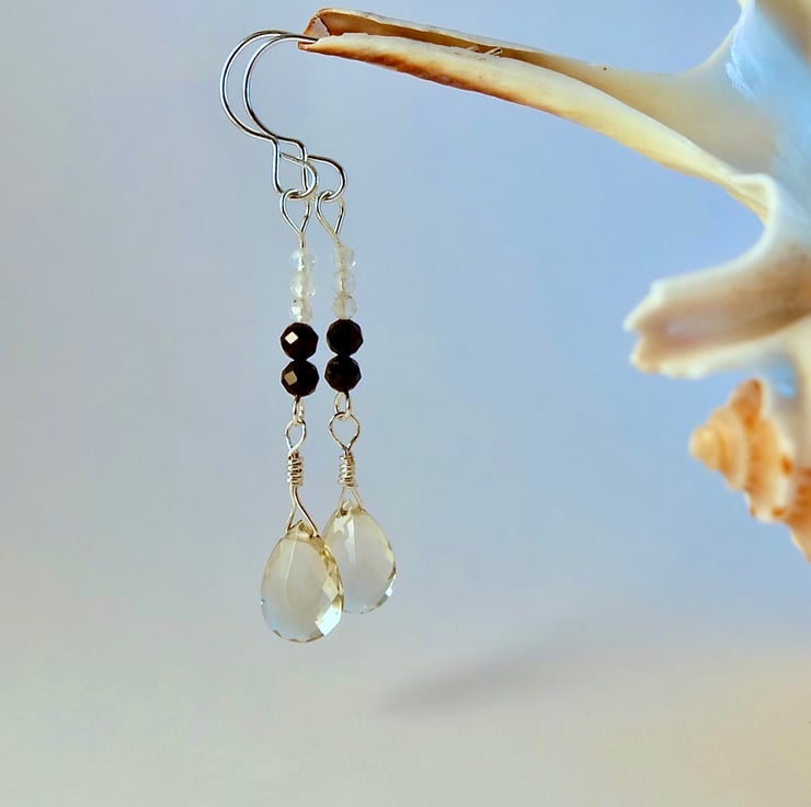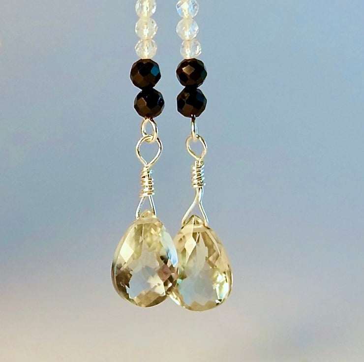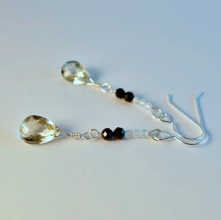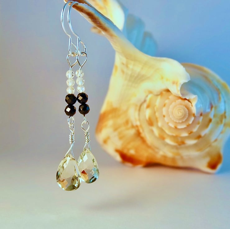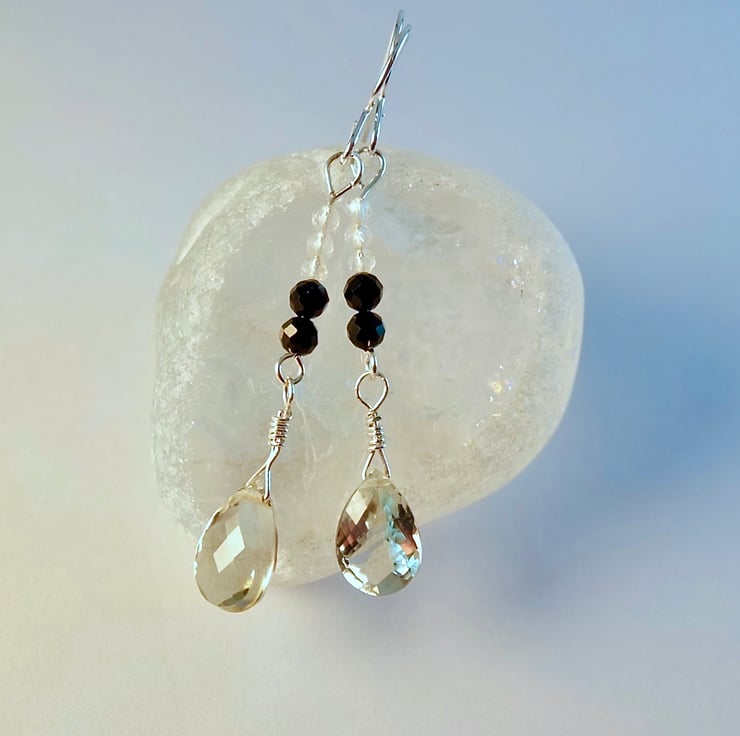 Each earring features a 12x7mm AA faceted Green Amethyst teardrop attached by sterling silver wire below a pair of 3mm AAA grade faceted black Spinel topped with a trio of 2mm AA grade faceted White Topaz beads.
