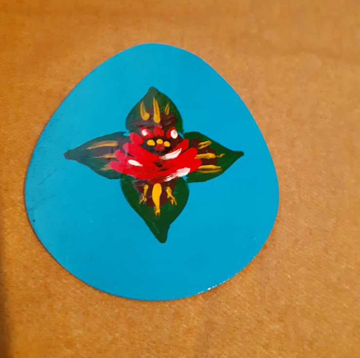 A wooden egg shaped magnet that has been painted bright blue. It has a red canal art style rose painted on it.