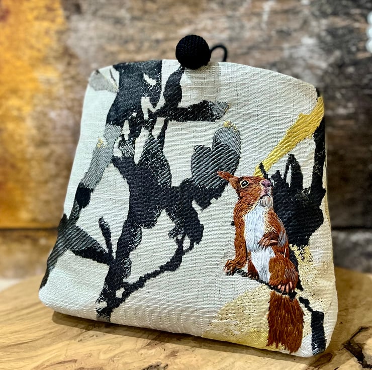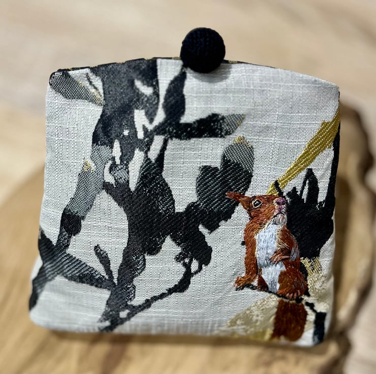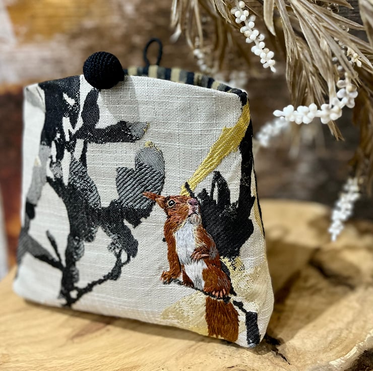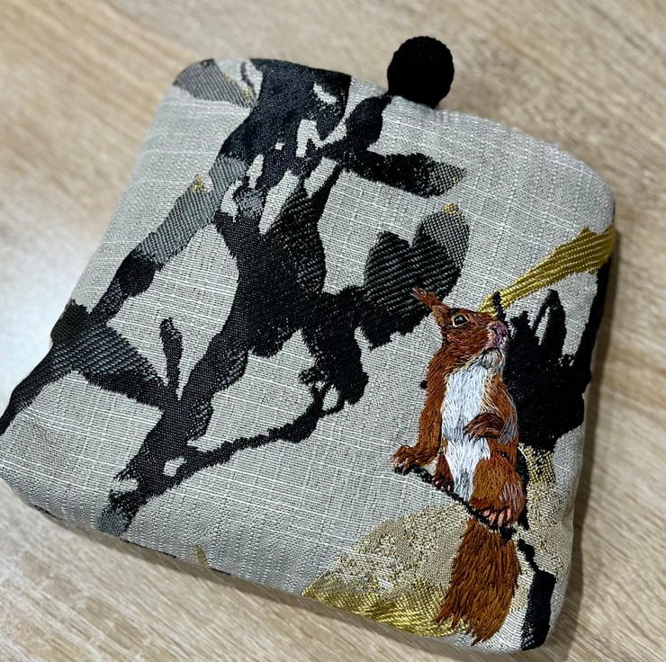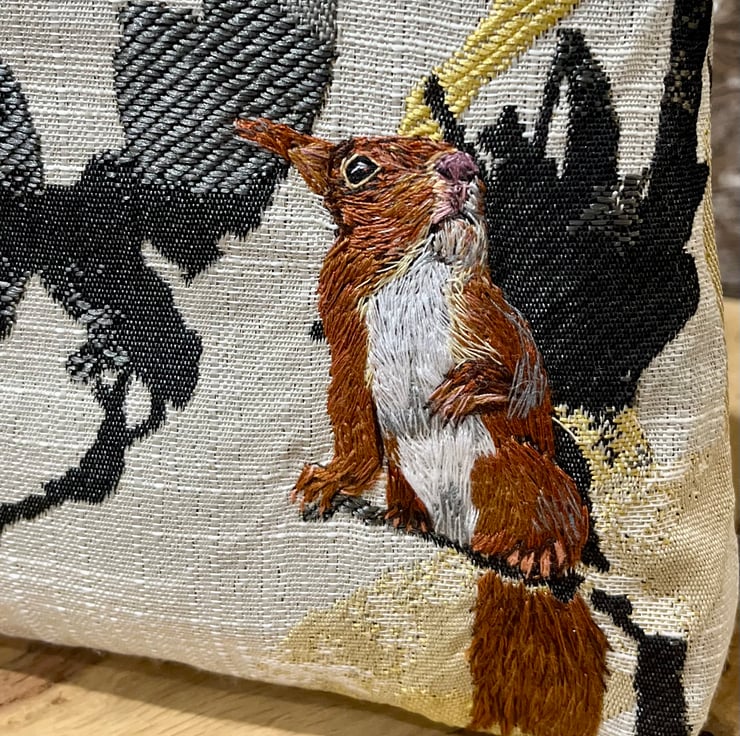 It is a fawn background with charcoal and gold foliage and has been decorated with a hand embroidery of a red squirrel gazing up to the top of the tree.