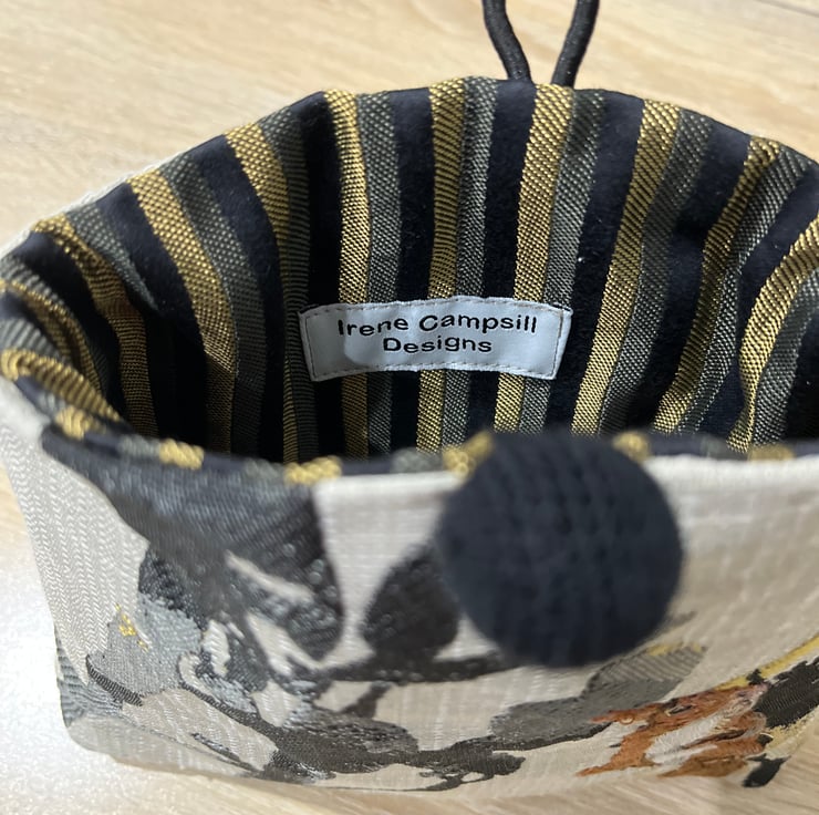 The bag fastens with an elasticated loop over a wooden bead with a black crochet cover and is lined in a contrasting textile of stripes of gold, black and grey which was a curtain fabric offcut.