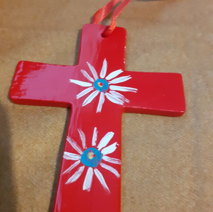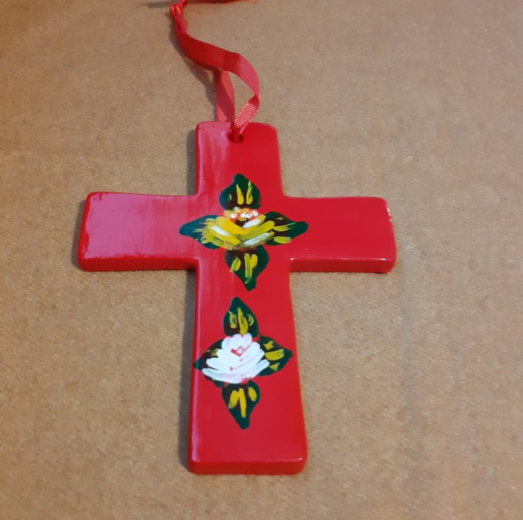 A ceramic cross painted bright red. It has one yellow and one white canal art style rose on one side and 2 daisies on the other. A red hanging ribbon is attached.