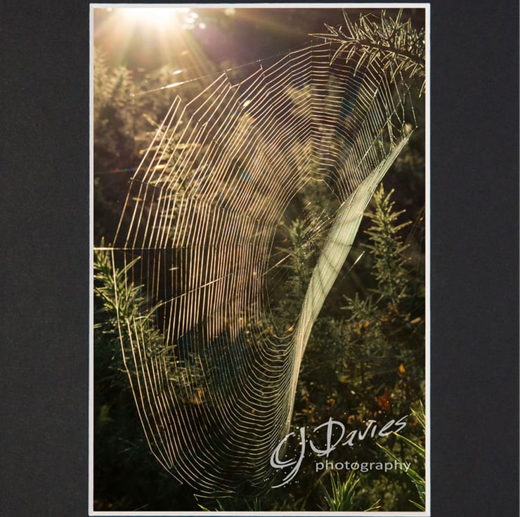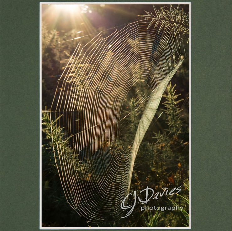 Early morning sun touches spider's web on the common near Frensham, Surrey.