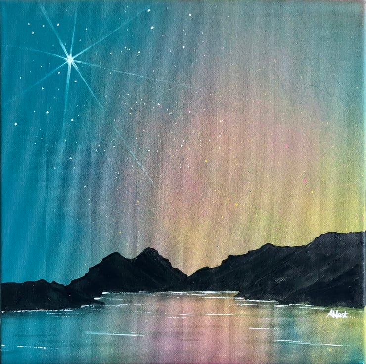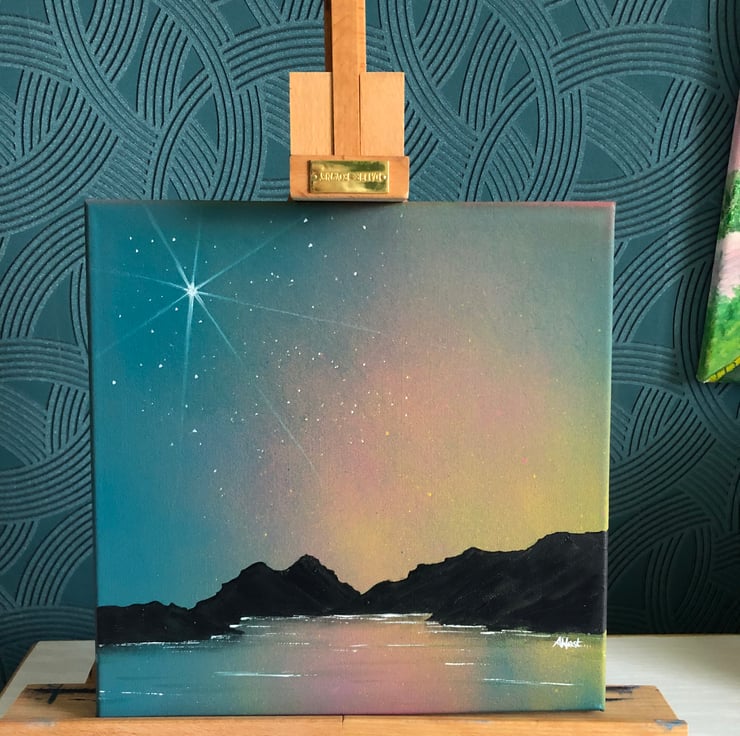 A scene of the Northern Lights in teal, yellow & pink with mountains and a twinkling star.